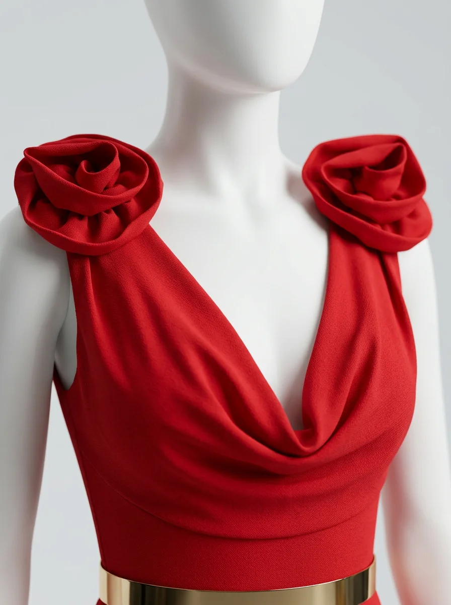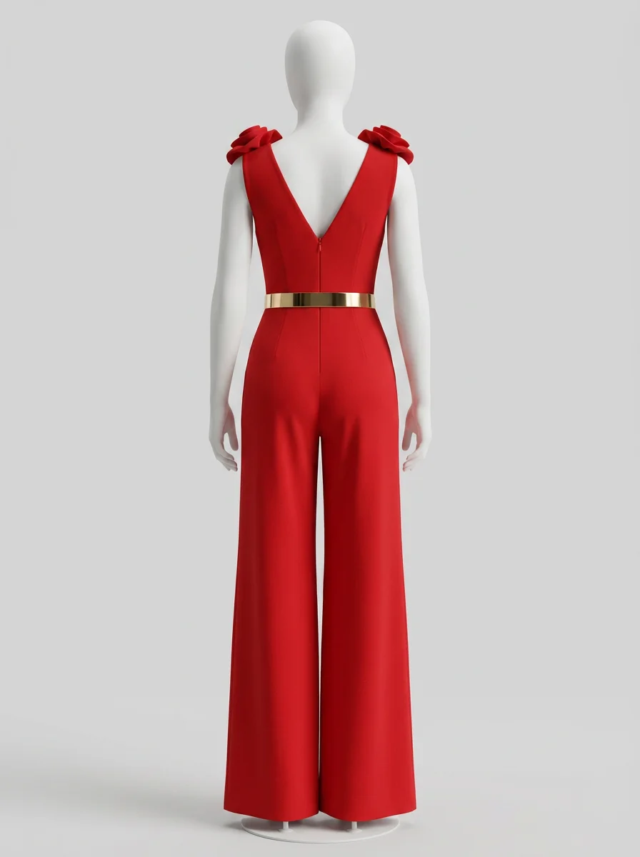 Des épaules marquées apportent une dimension architecturale alors qu’un décolleté en V souligne le buste avec finesse. Une ceinture dorée vient définir la taille pour créer un équilibre visuel parfait, idéal pour assurer une présence mémorable et raffinée.