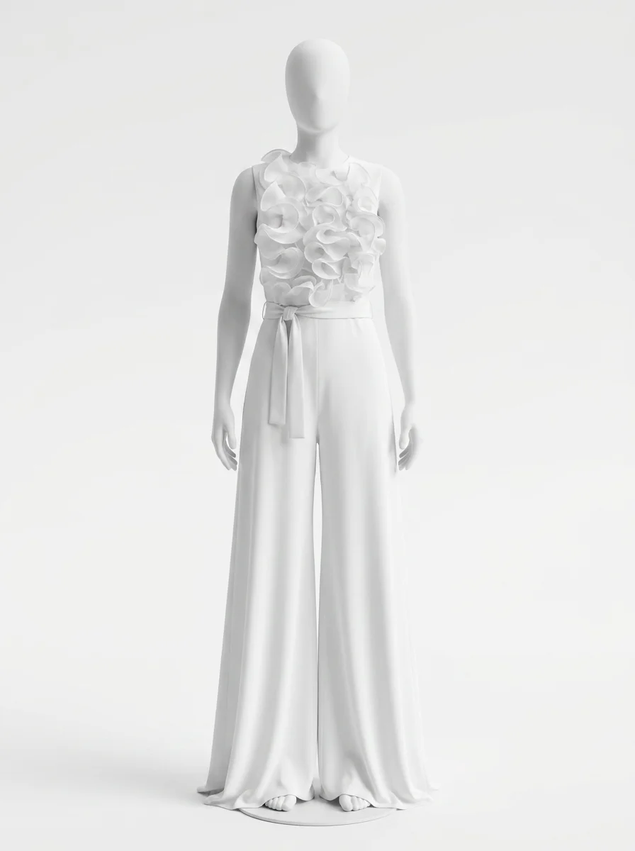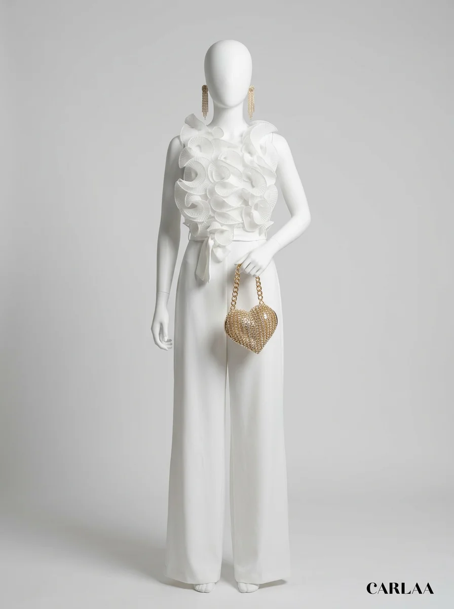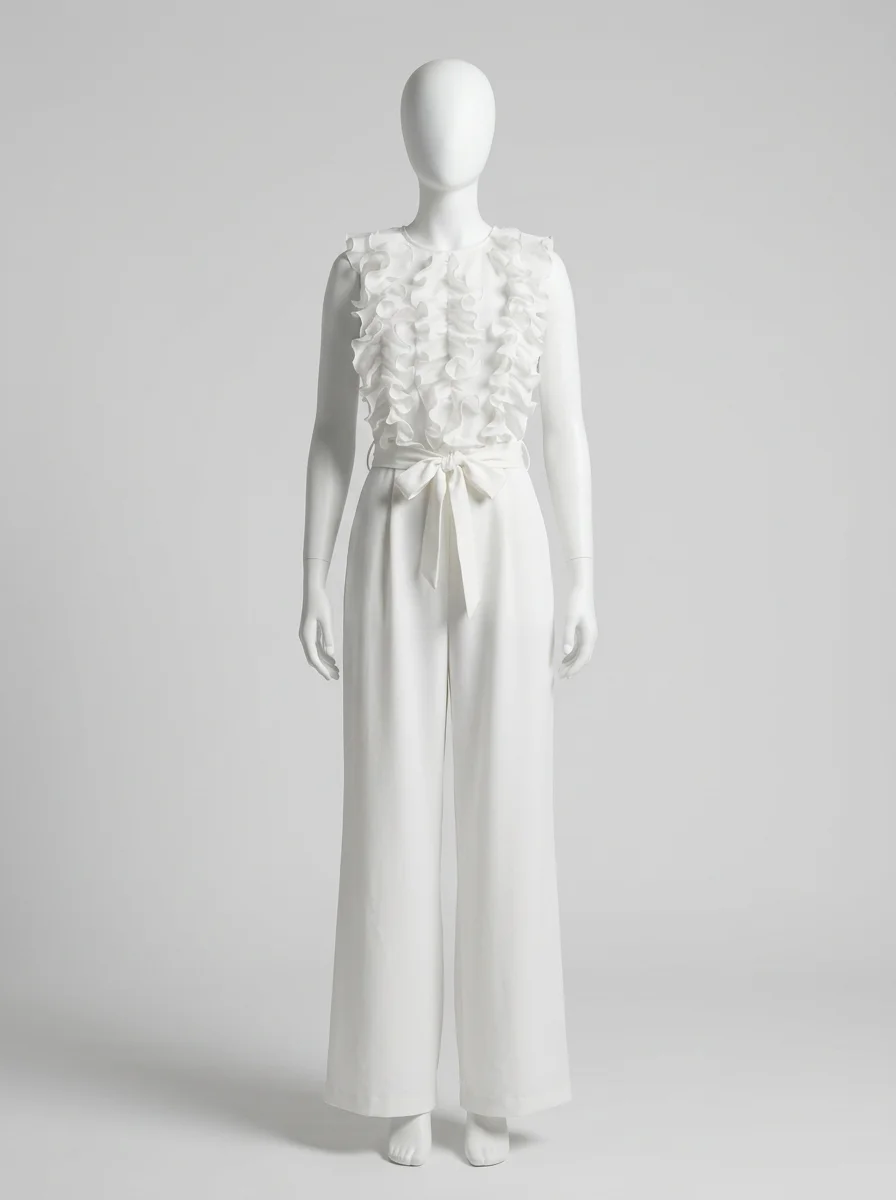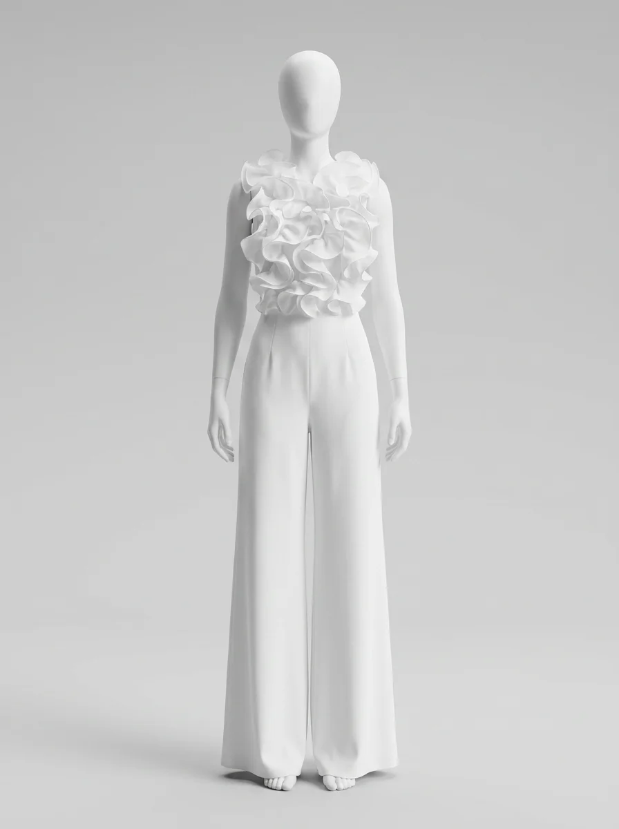 Une allure sophistiquée devient accessible grâce à une pièce unique au design travaillé. Les volants délicats apportent un volume aérien au buste, créant un contraste saisissant avec la fluidité du bas. Pour parfaire une garde-robe de soirée, l’adoption d’une combinaison pantalon chic assure une élégance sans effort et une silhouette élancée en toute circonstance.
