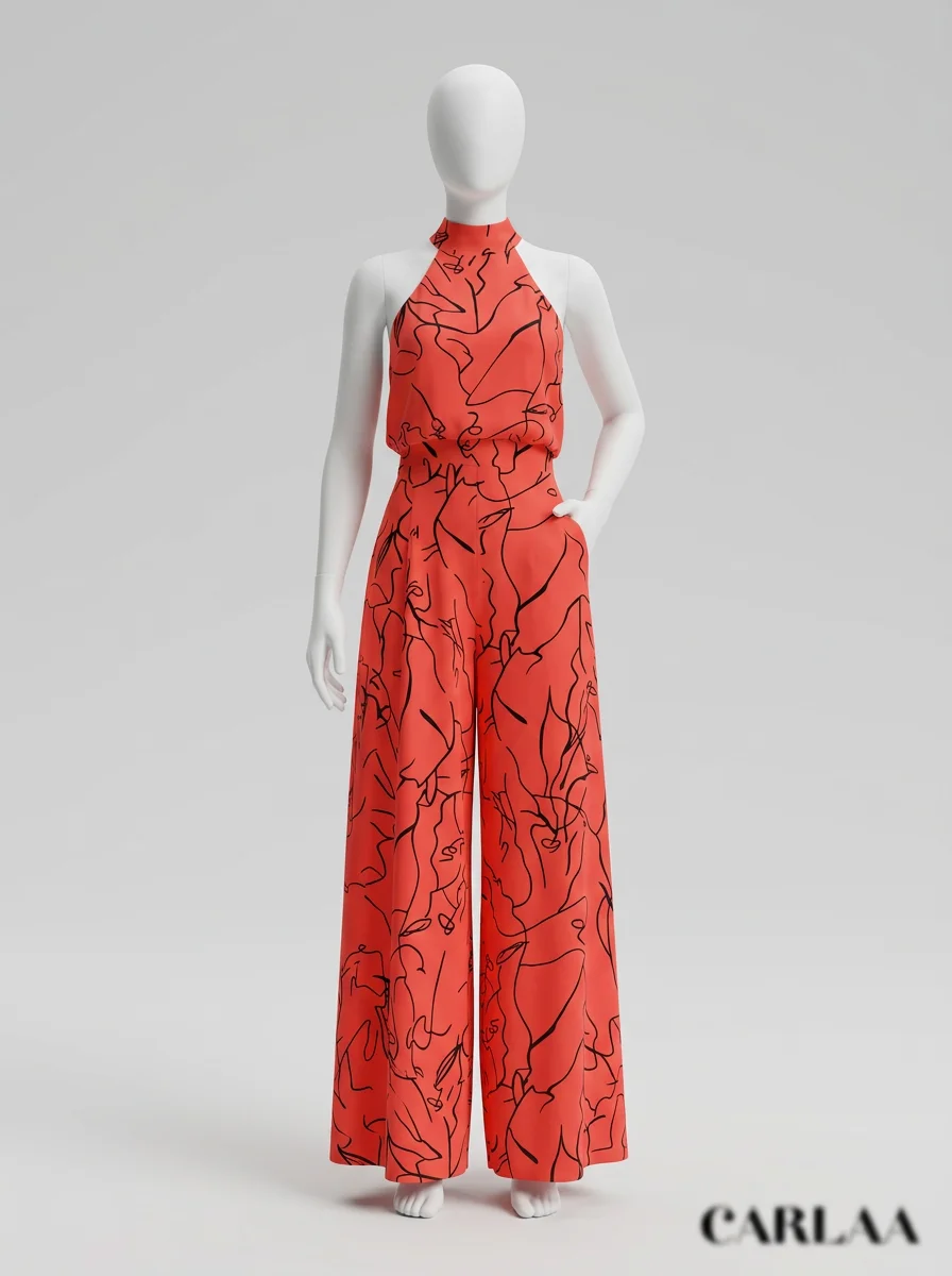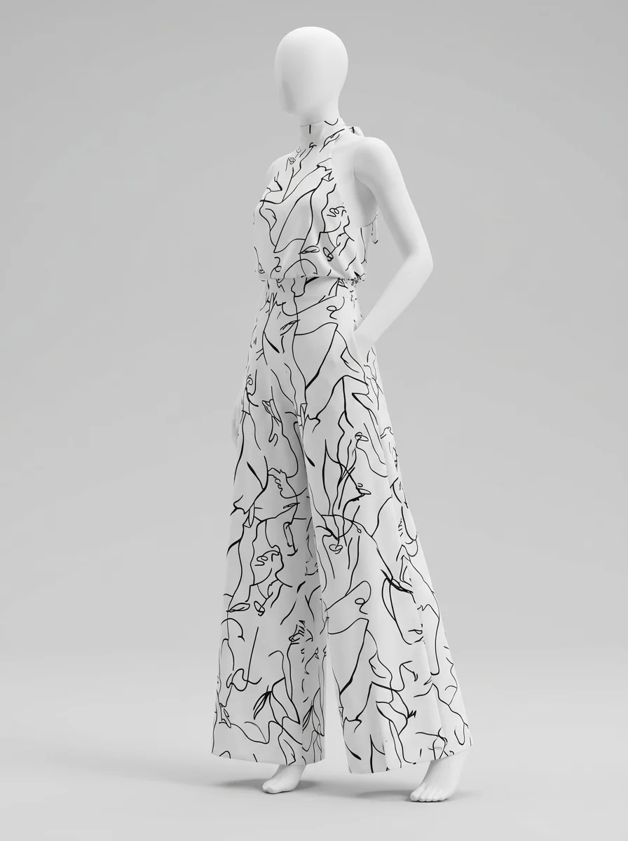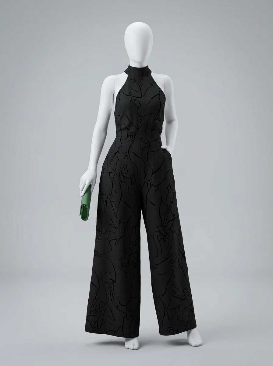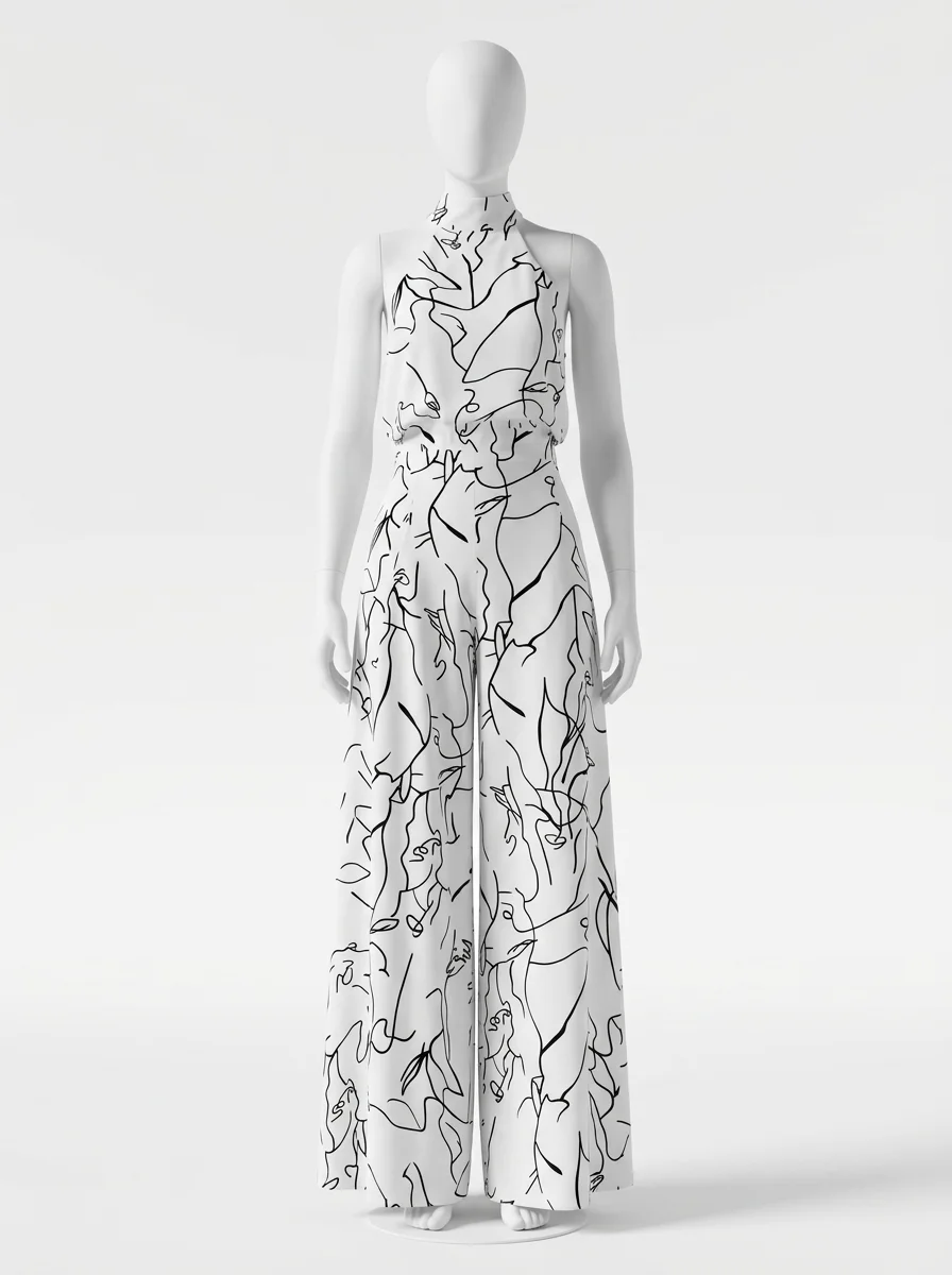 Le pantalon large assure une liberté de mouvement totale tout en allongeant la jambe. Le design sans manches, associé à une encolure haute, dégage les épaules avec le raffinement d’une combinaison habillée femme pour une présence remarquée.