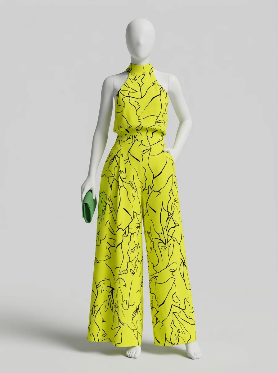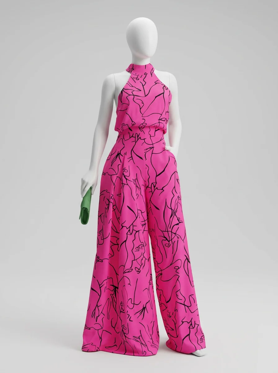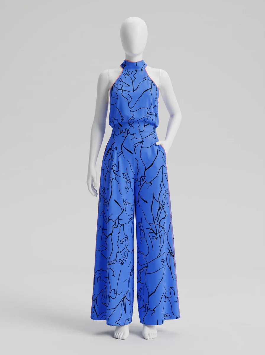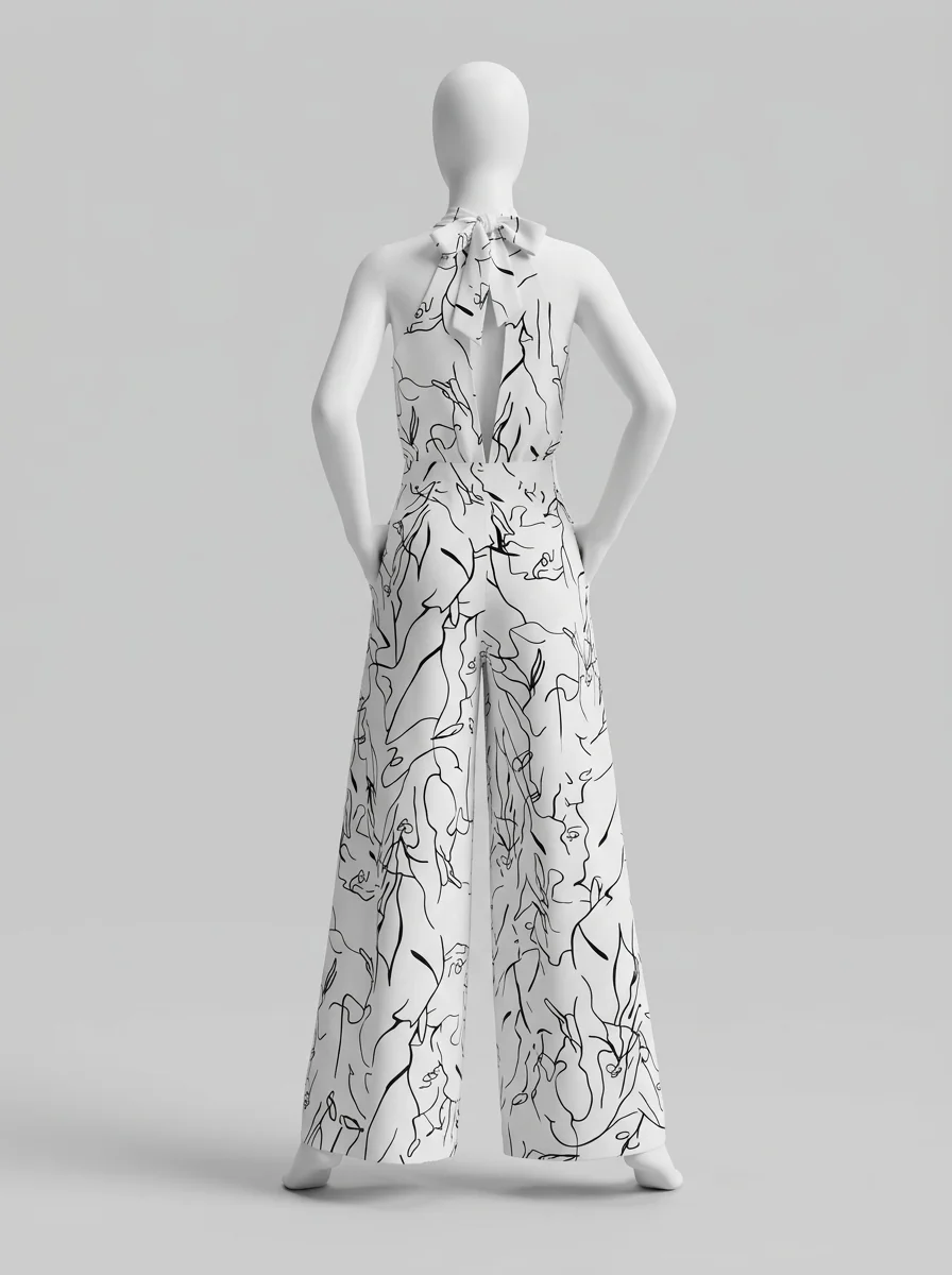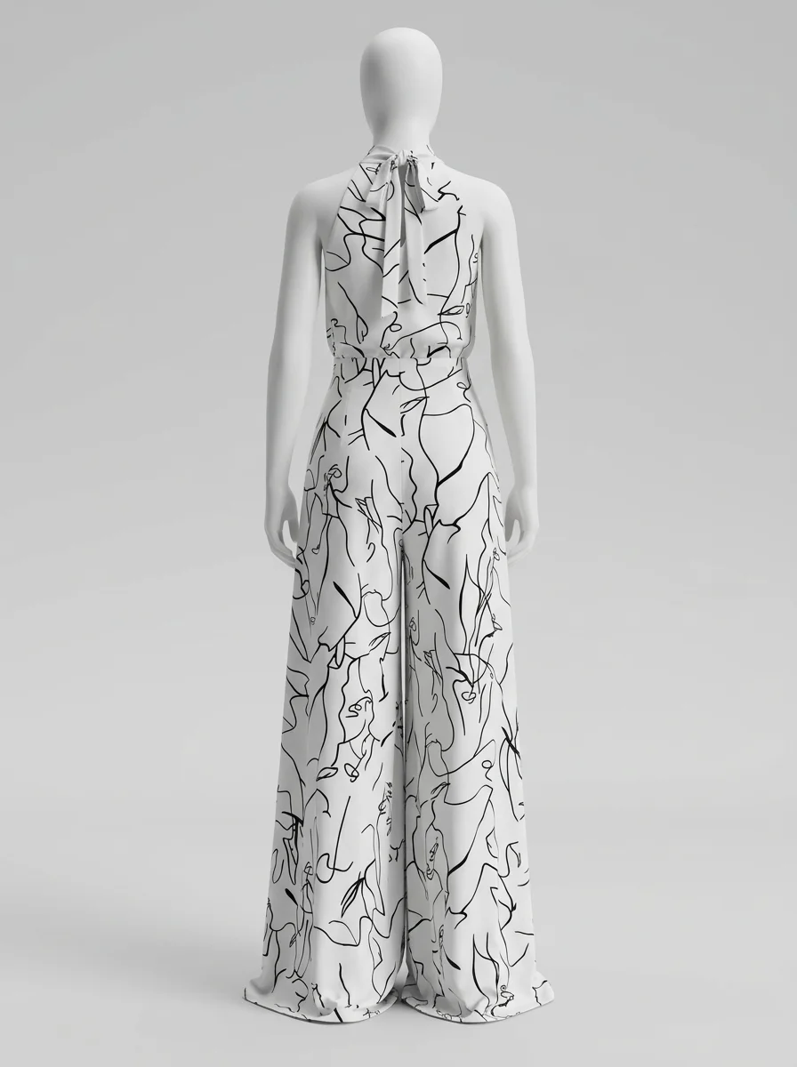 Le pantalon large assure une liberté de mouvement totale tout en allongeant la jambe. Le design sans manches, associé à une encolure haute, dégage les épaules avec le raffinement d’une combinaison habillée femme pour une présence remarquée.