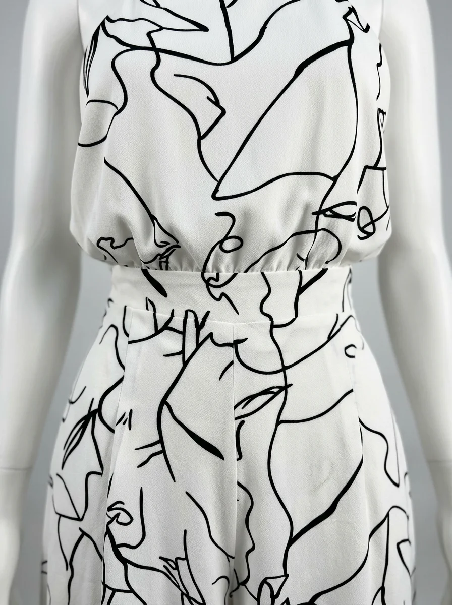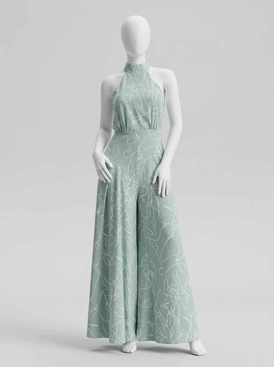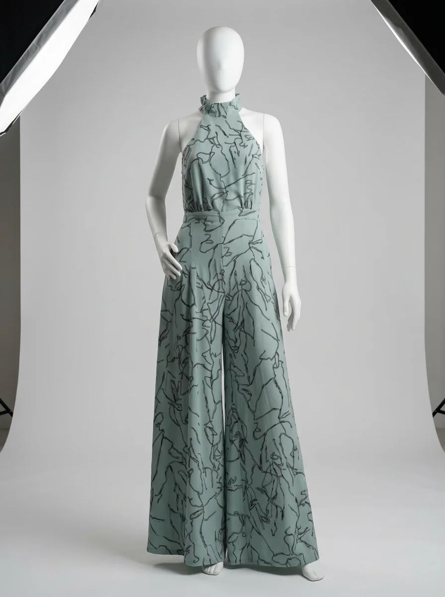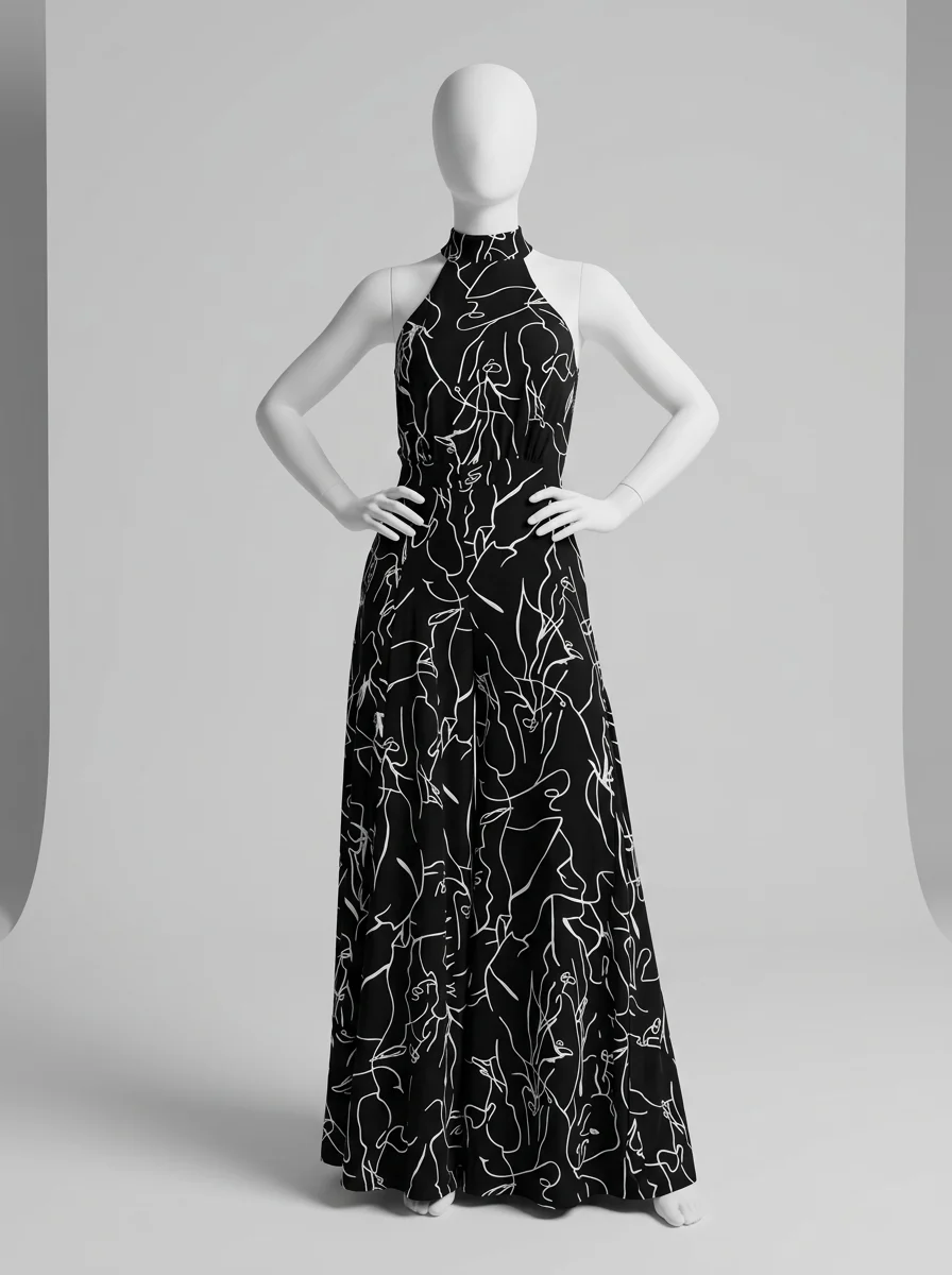 Le pantalon large assure une liberté de mouvement totale tout en allongeant la jambe. Le design sans manches, associé à une encolure haute, dégage les épaules avec le raffinement d’une combinaison habillée femme pour une présence remarquée.