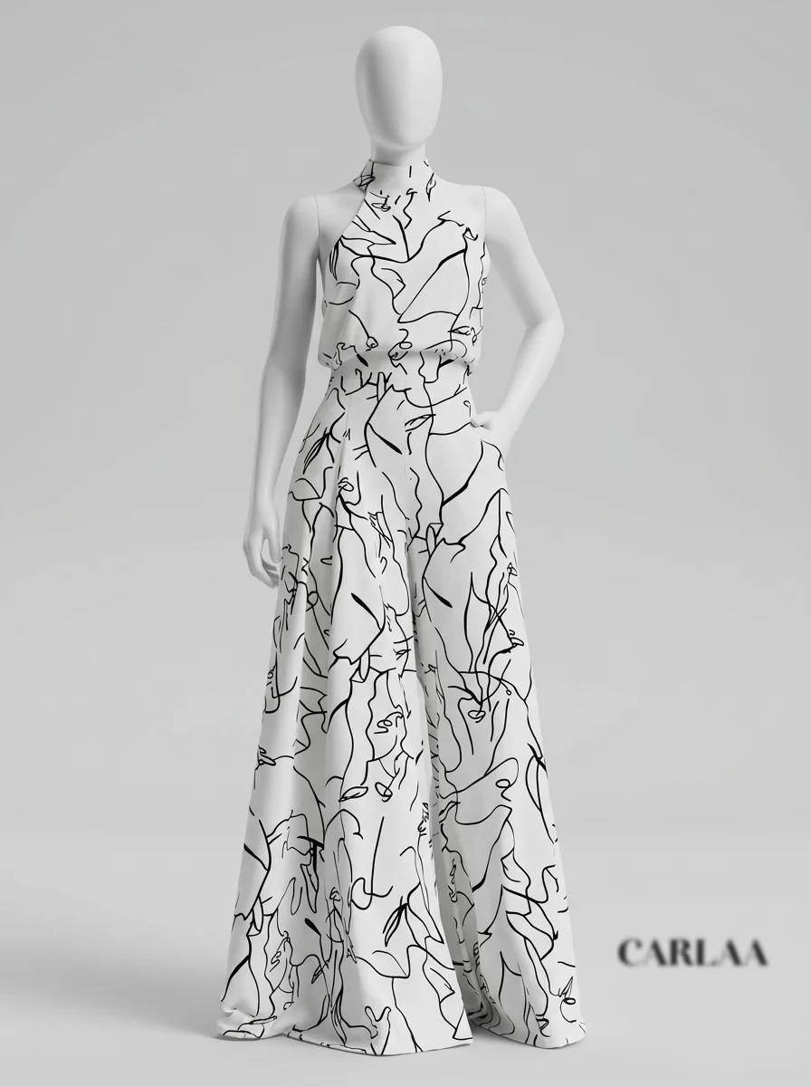 Les silhouettes s’illuminent grâce à un imprimé artistique captivant qui recouvre l’intégralité de la pièce. Un vêtement idéal pour accompagner une combinaison pantalon mariage lors d’une réception prestigieuse ou d’une soirée estivale.