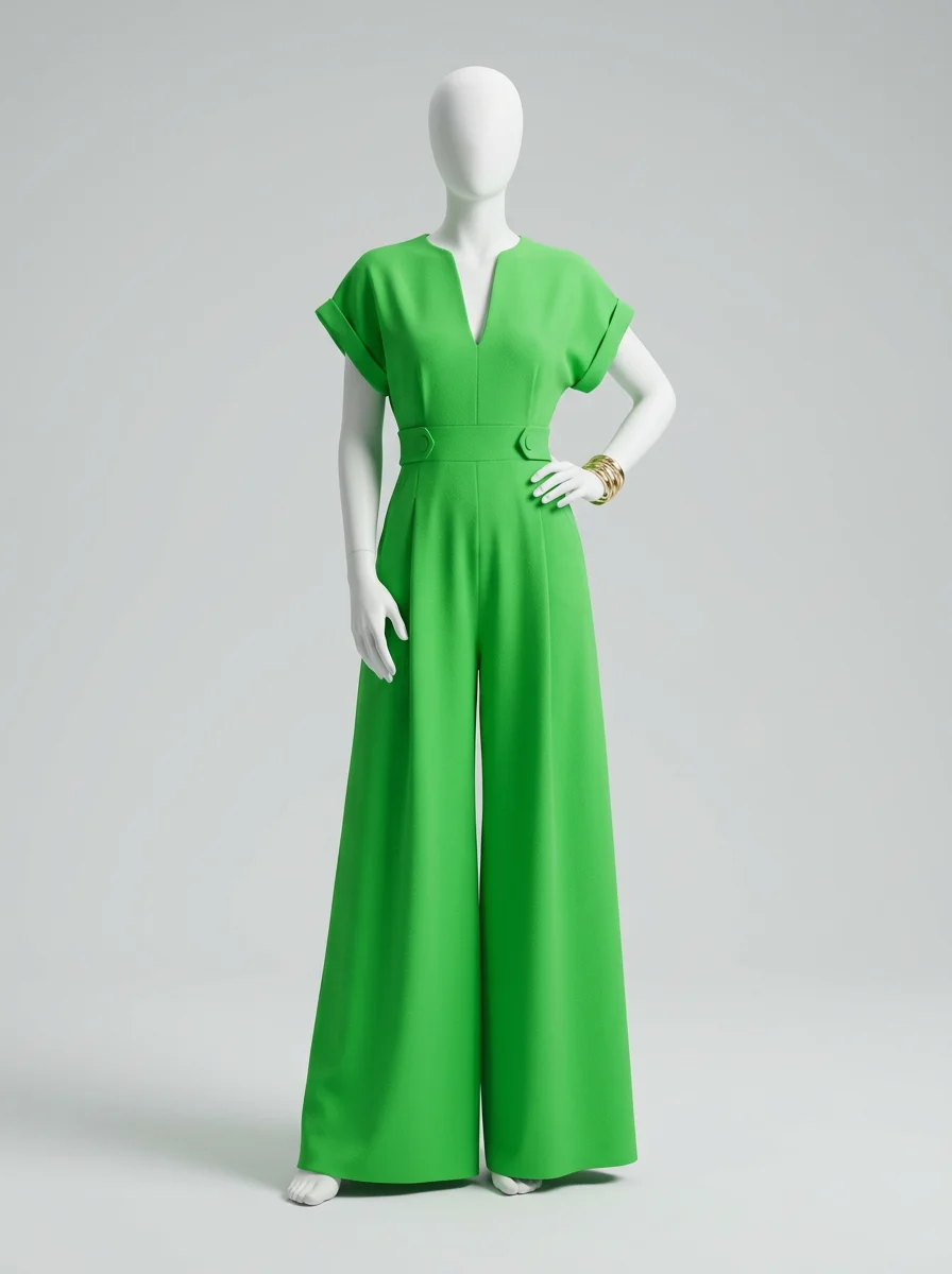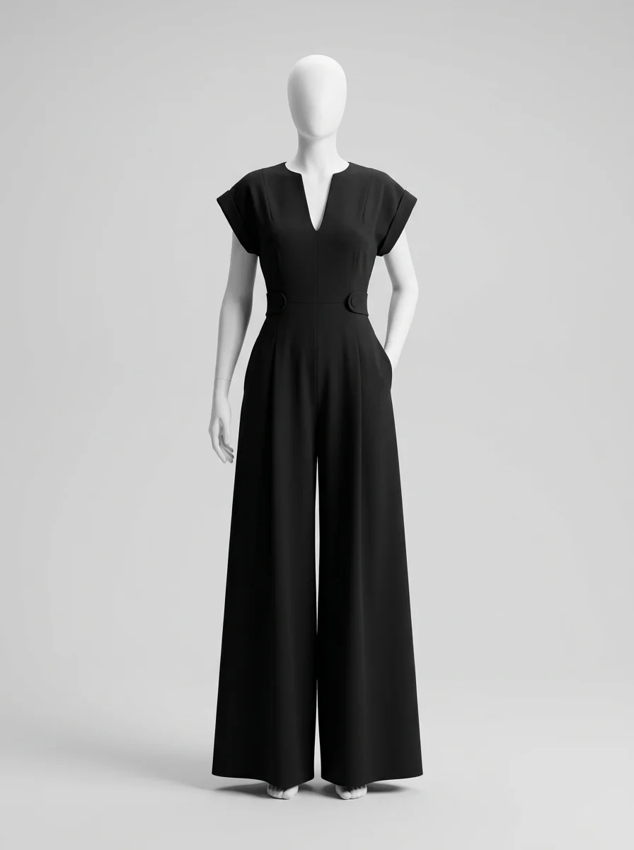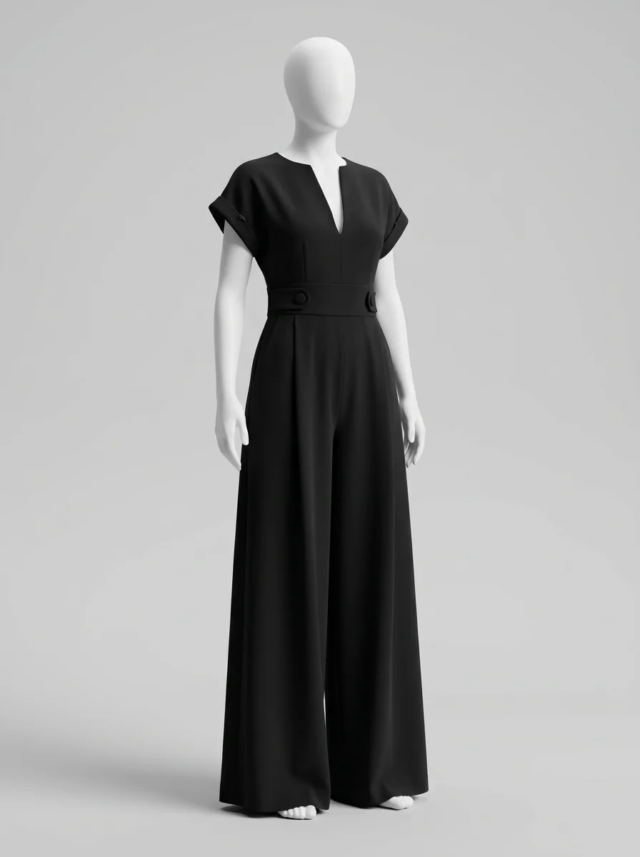 Des jambes amples associées à un décolleté en V créent un équilibre visuel impeccable. Les matières fluides assurent une liberté de mouvement optimale pour briller lors de moments d’exception.
