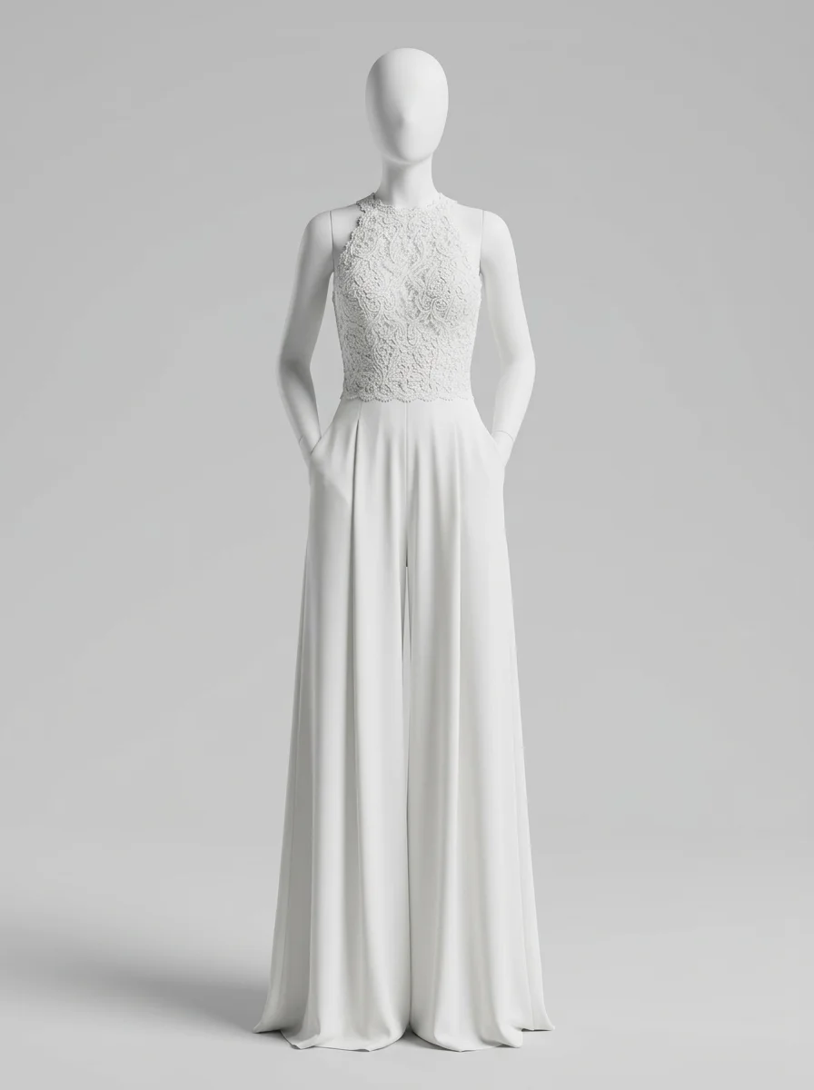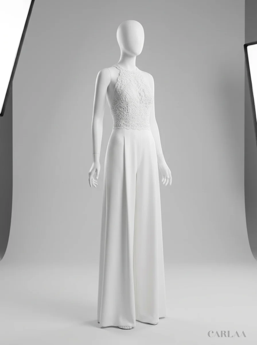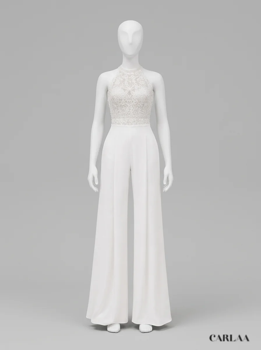 Les mariées modernes trouvent ici une alternative raffinée à la robe traditionnelle. Un bustier en dentelle délicatement ouvragé s’associe à un pantalon large en tissu fluide pour composer une combinaison pantalon mariage à la fois confortable et sophistiquée.