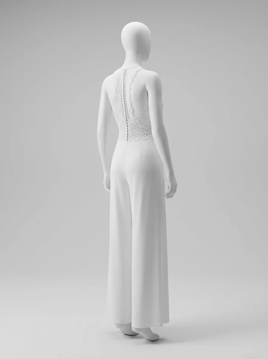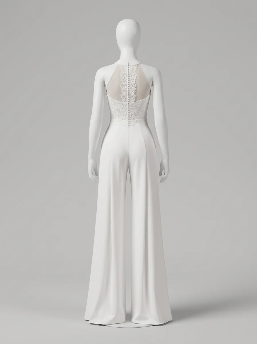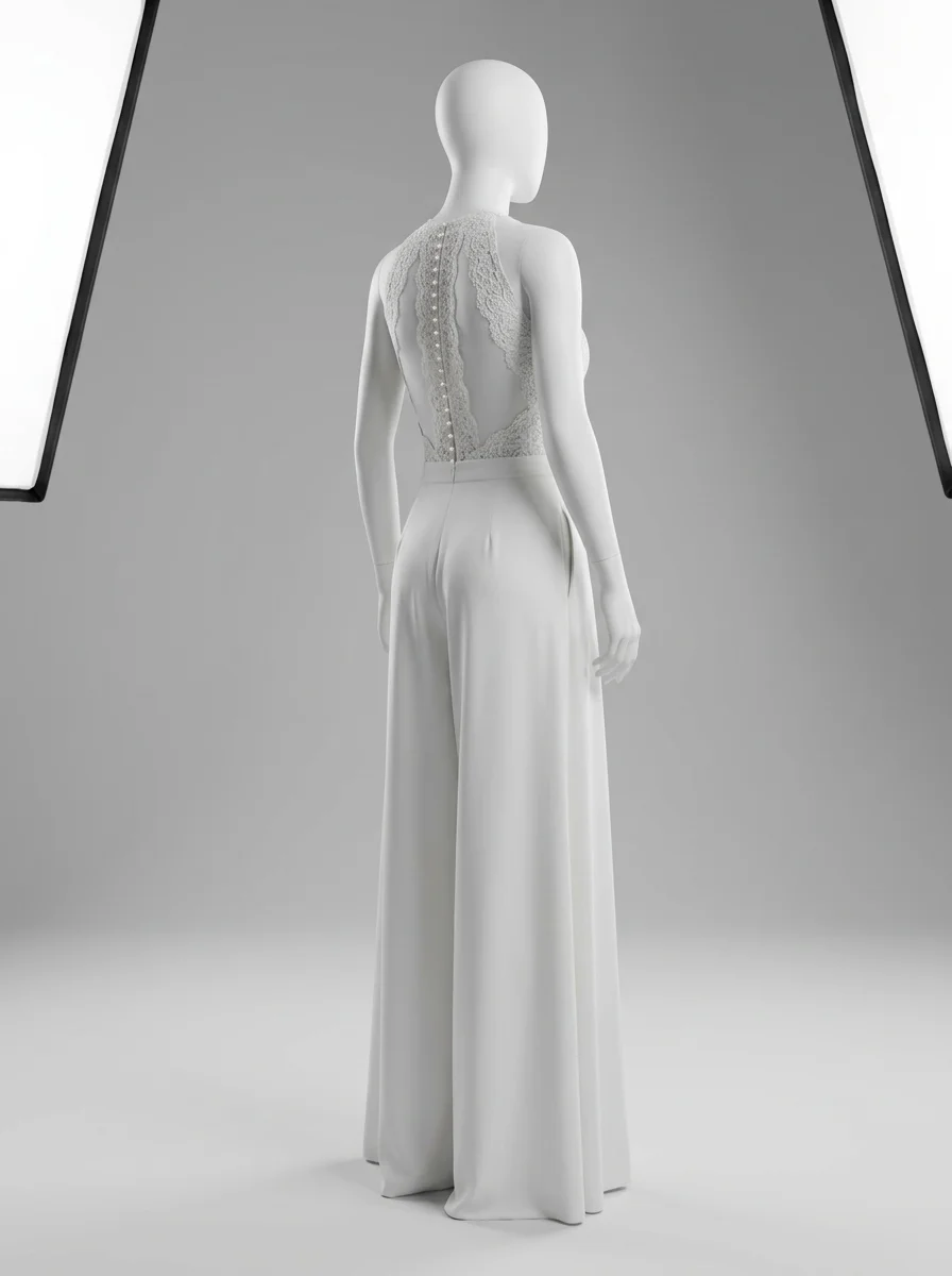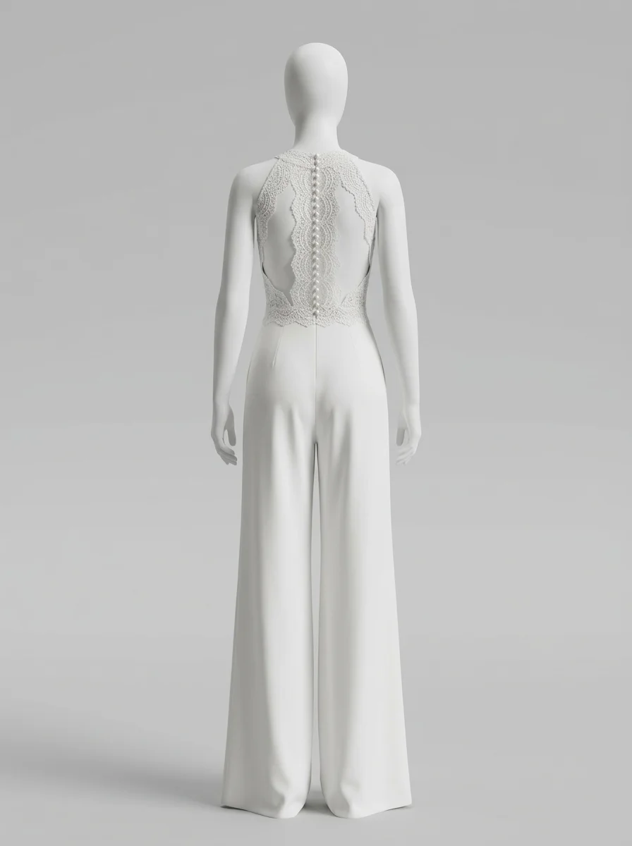 Les mariées modernes trouvent ici une alternative raffinée à la robe traditionnelle. Un bustier en dentelle délicatement ouvragé s’associe à un pantalon large en tissu fluide pour composer une combinaison pantalon mariage à la fois confortable et sophistiquée.
