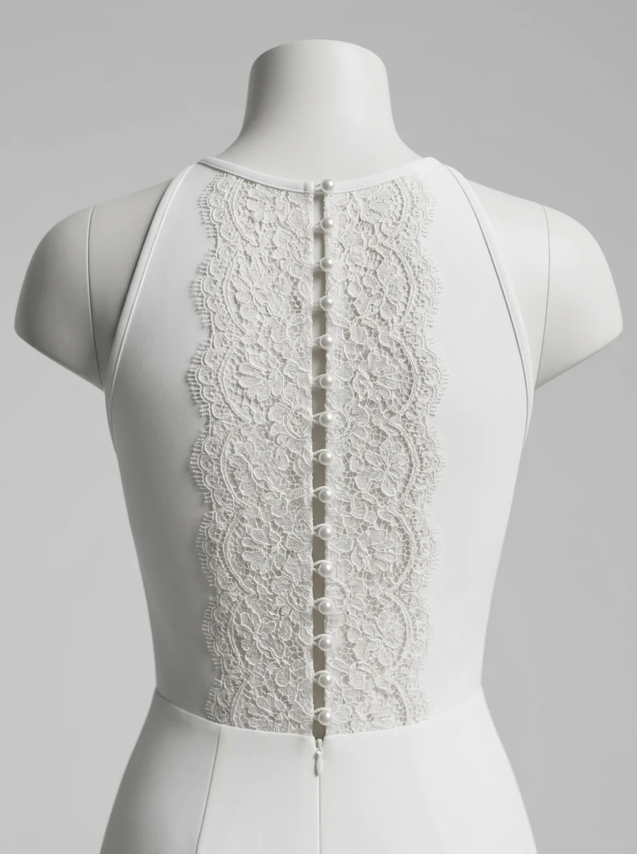 Des boutons en perles ornent un dos subtilement ouvert, apportant une touche de lumière à une silhouette élancée. Des coupes sans manches et des finitions soignées garantissent une élégance intemporelle pour vivre des instants mémorables.