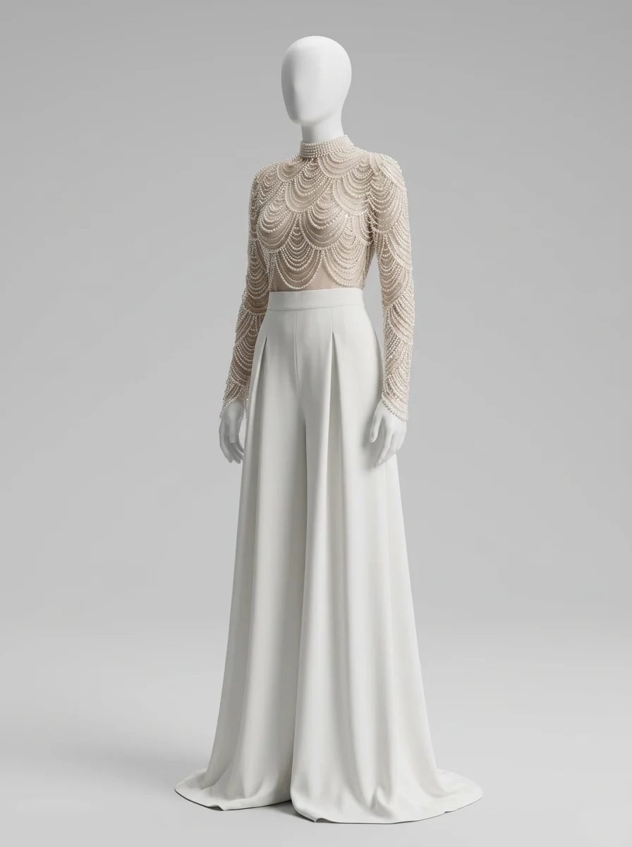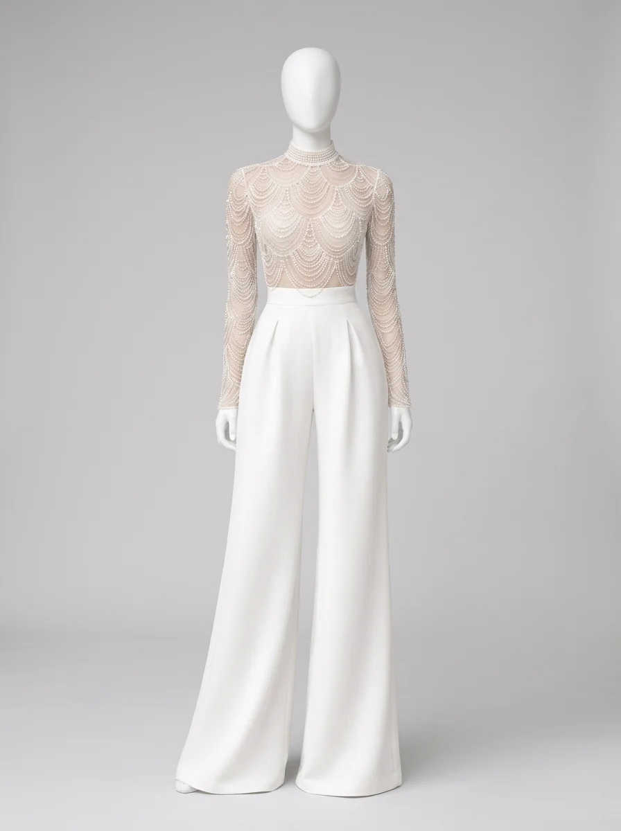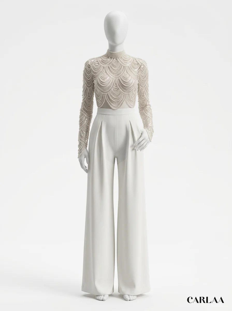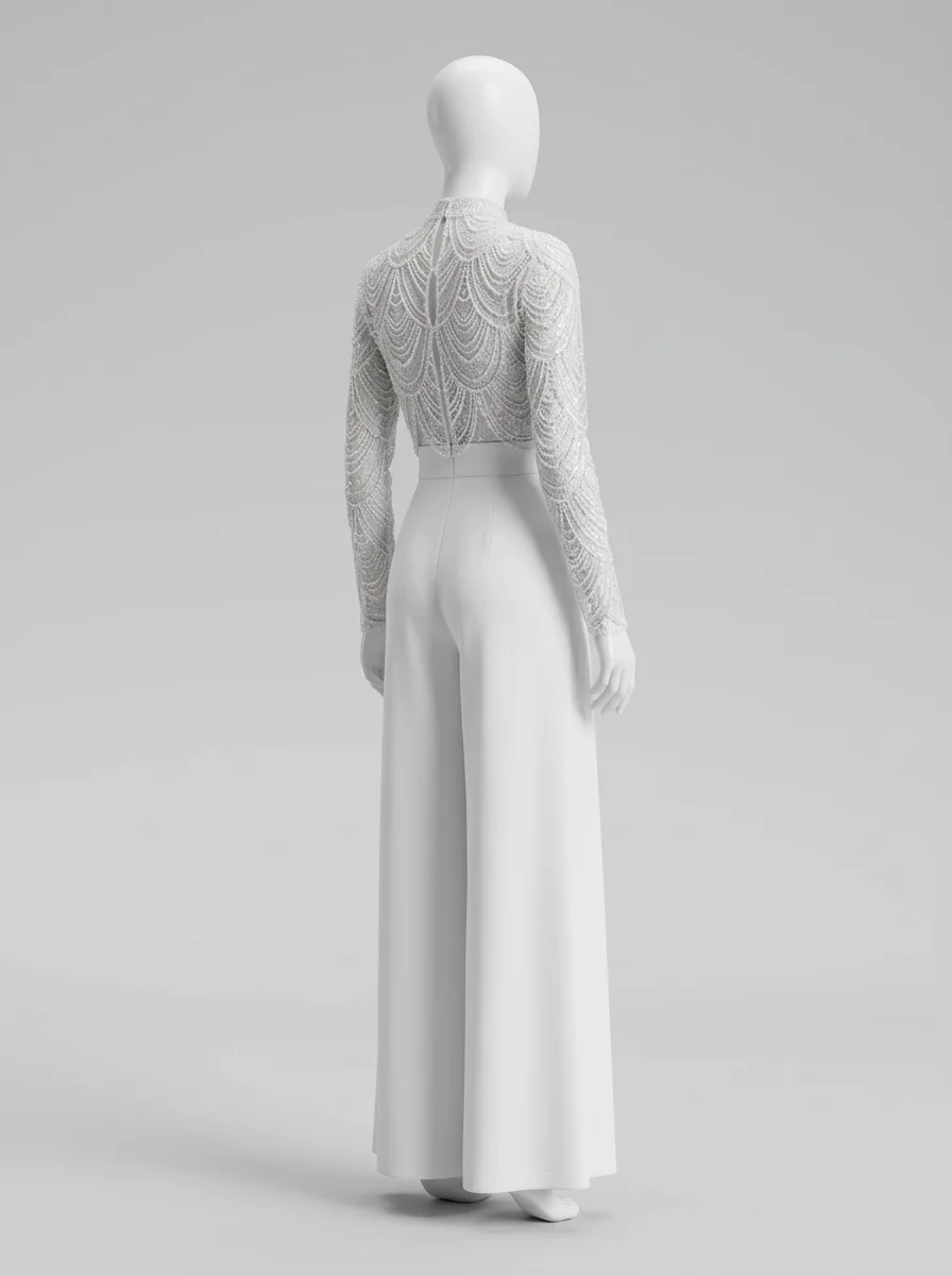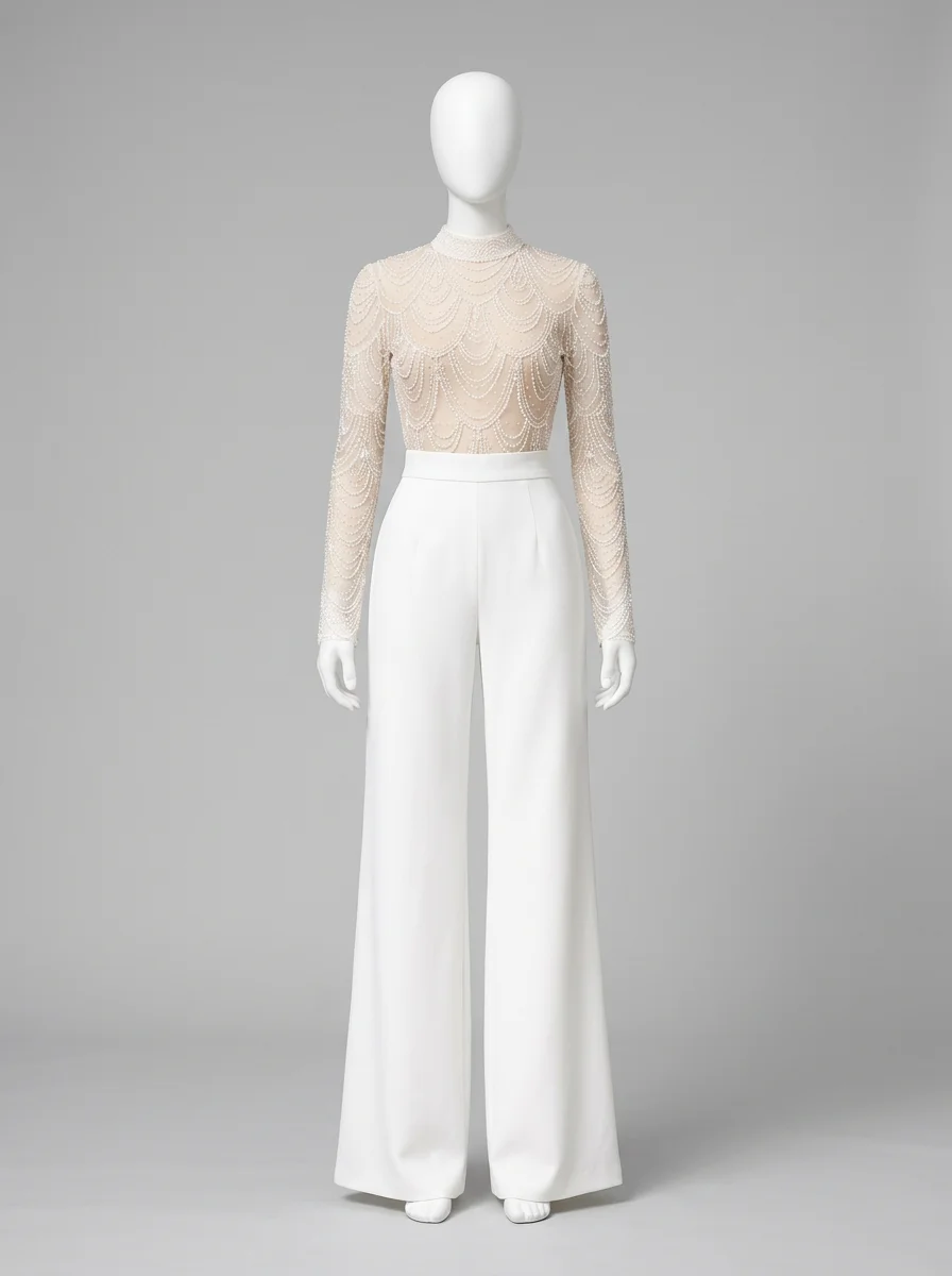 L’élégance rencontre la légèreté dans une création pensée pour les journées ensoleillées. Un haut en dentelle délicate s’associe à des manches longues transparentes pour offrir une silhouette raffinée. L’intégration au sein d’une combinaison pantalon mariage convient idéalement aux femmes en quête d’un style moderne et distingué.