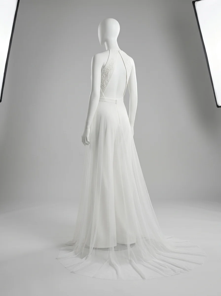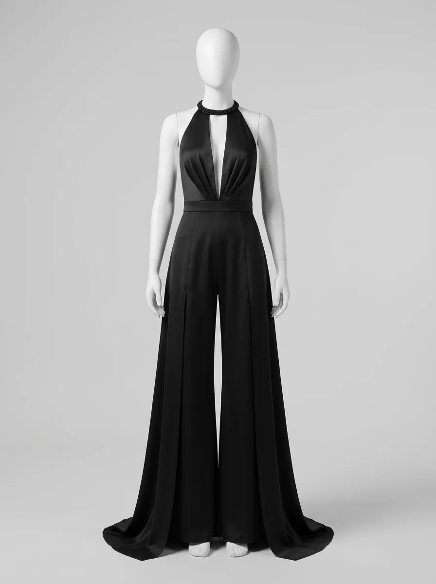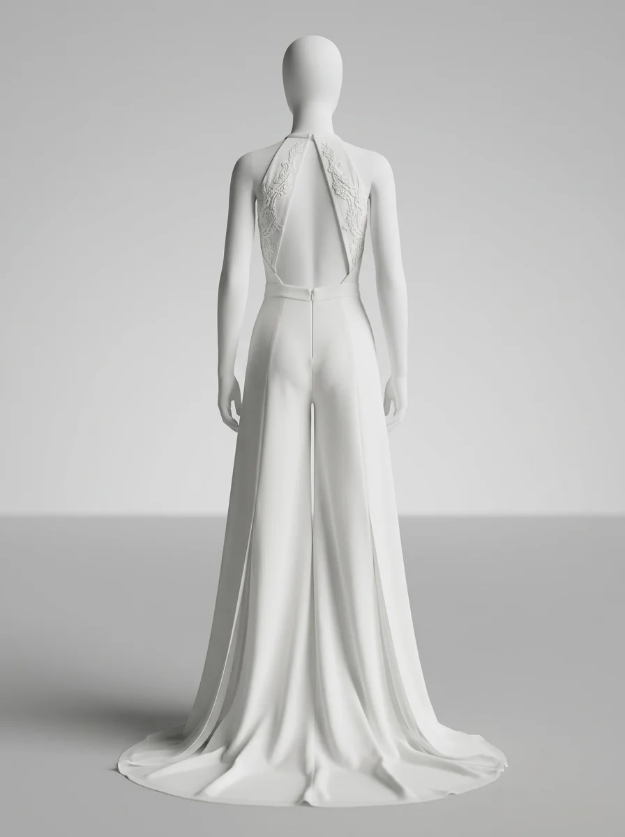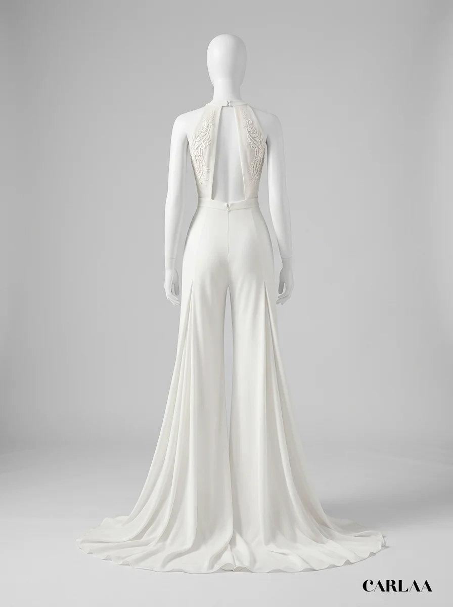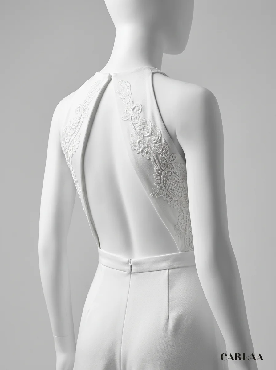 L’élégance rencontre l’audace dans une création pensée pour sublimer la silhouette lors des moments les plus précieux. Un haut halter échancré dévoile délicatement les épaules, tandis qu’un dos nu orné de dentelle apporte une dimension artisanale et raffinée. Pour les invitées ou les mariées recherchant une alternative moderne à la robe traditionnelle, la combinaison pantalon mariage s’impose comme le choix idéal, offrant une liberté de mouvement absolue sans sacrifier le prestige de la tenue.