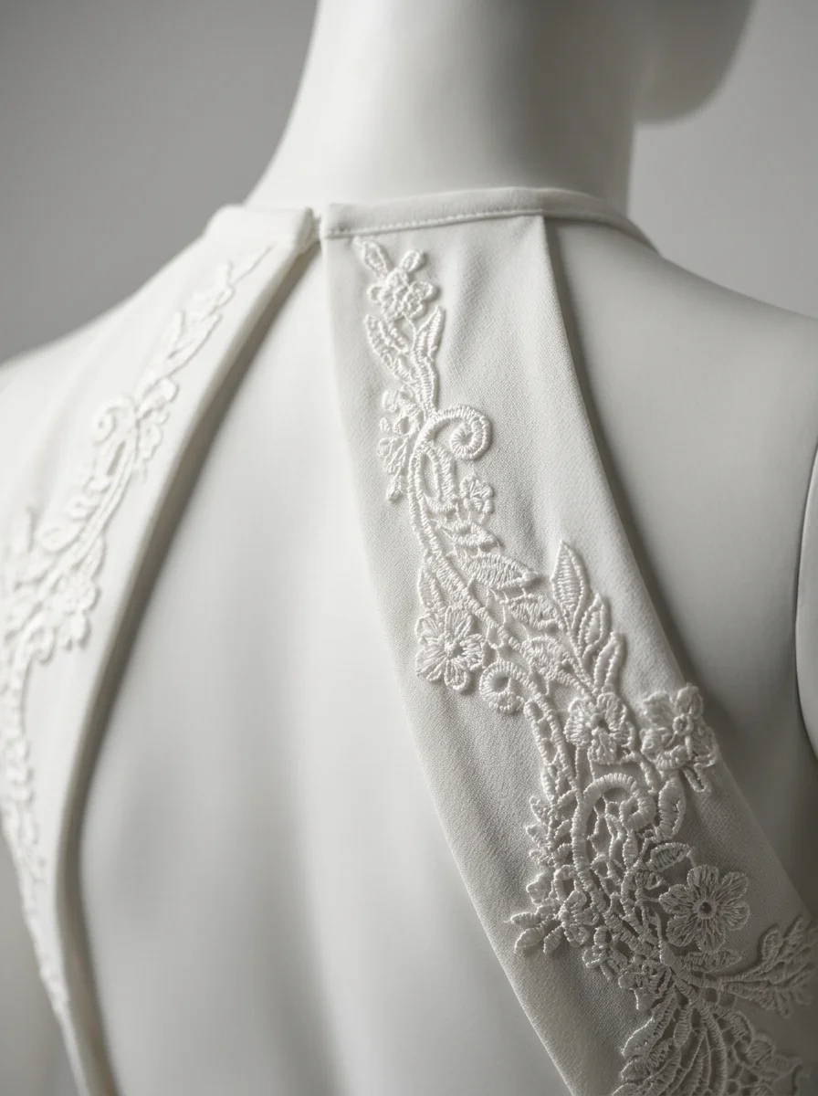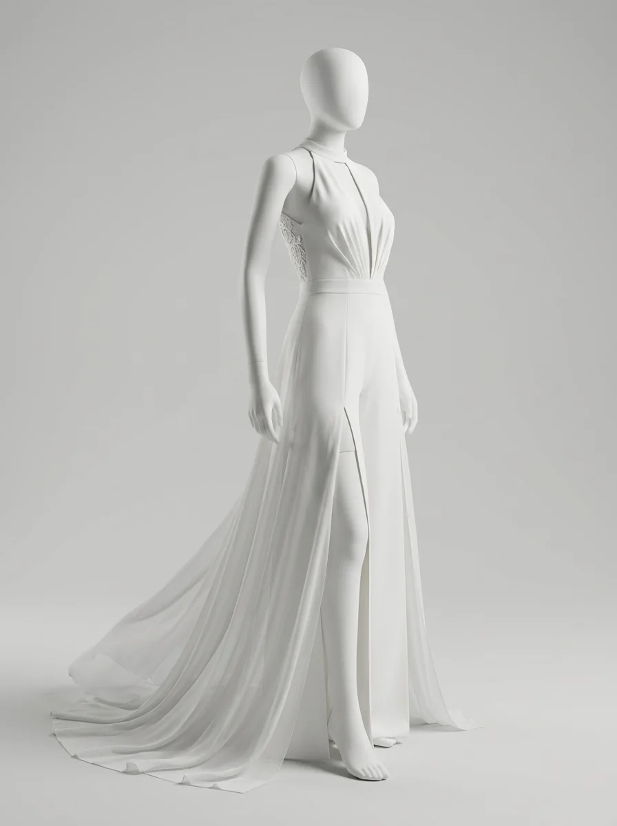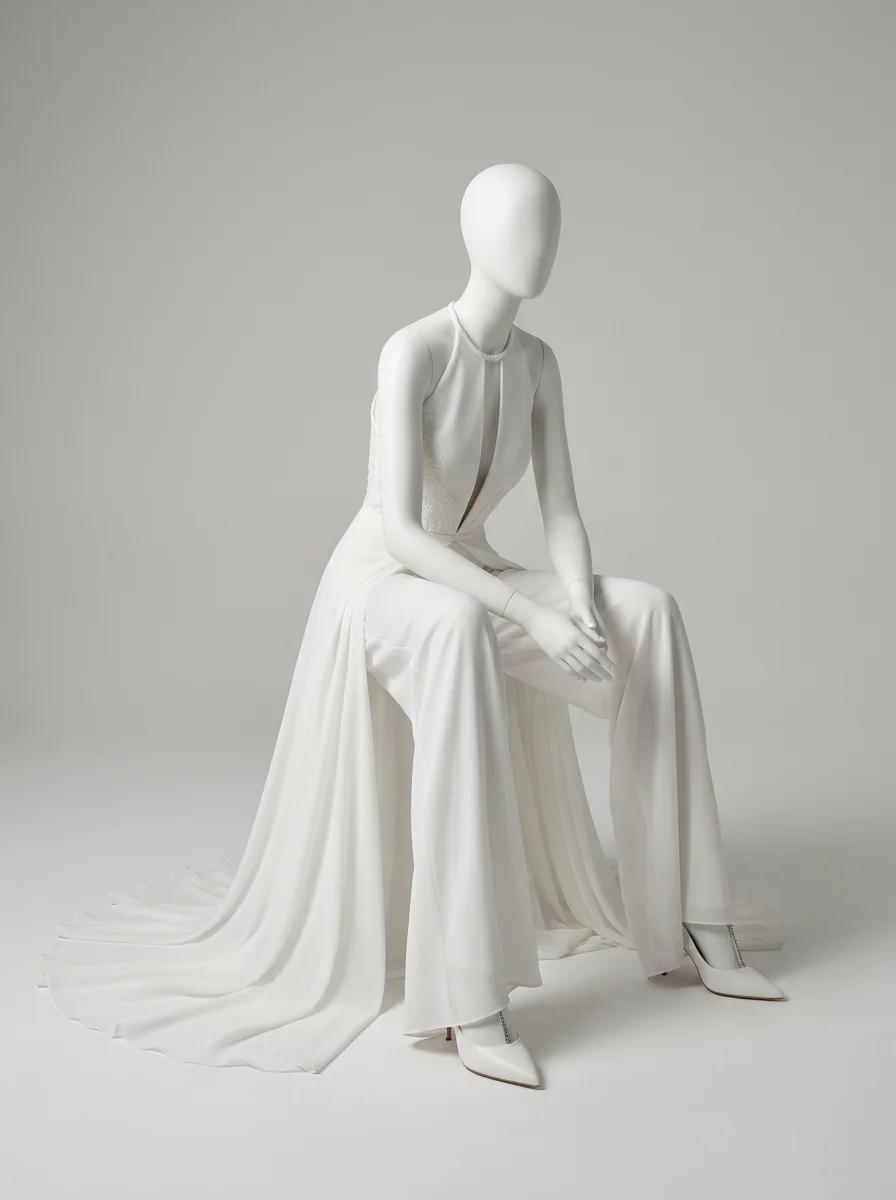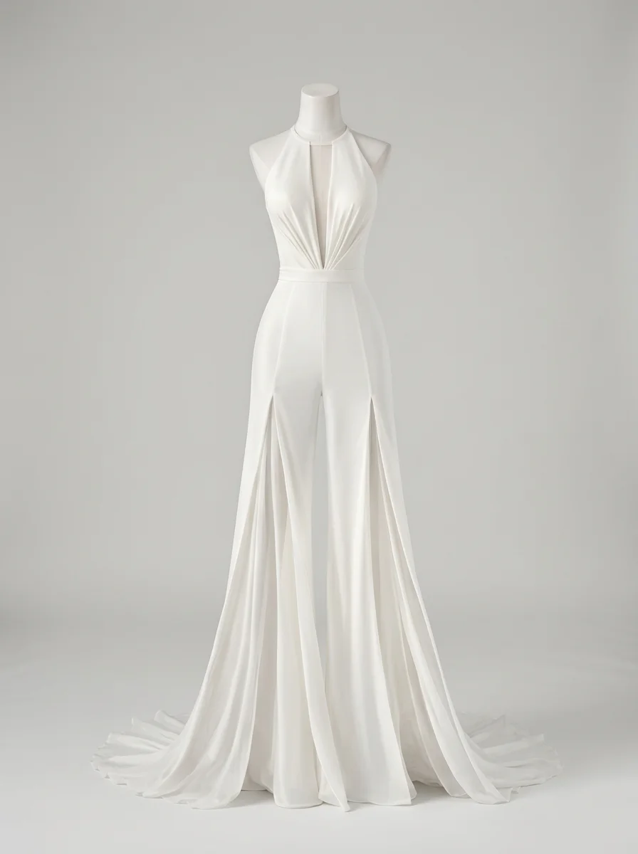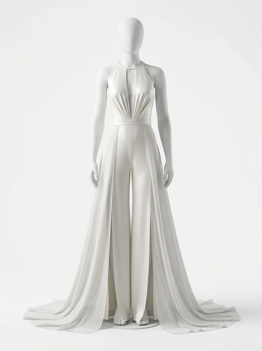 L’élégance rencontre l’audace dans une création pensée pour sublimer la silhouette lors des moments les plus précieux. Un haut halter échancré dévoile délicatement les épaules, tandis qu’un dos nu orné de dentelle apporte une dimension artisanale et raffinée. Pour les invitées ou les mariées recherchant une alternative moderne à la robe traditionnelle, la combinaison pantalon mariage s’impose comme le choix idéal, offrant une liberté de mouvement absolue sans sacrifier le prestige de la tenue.