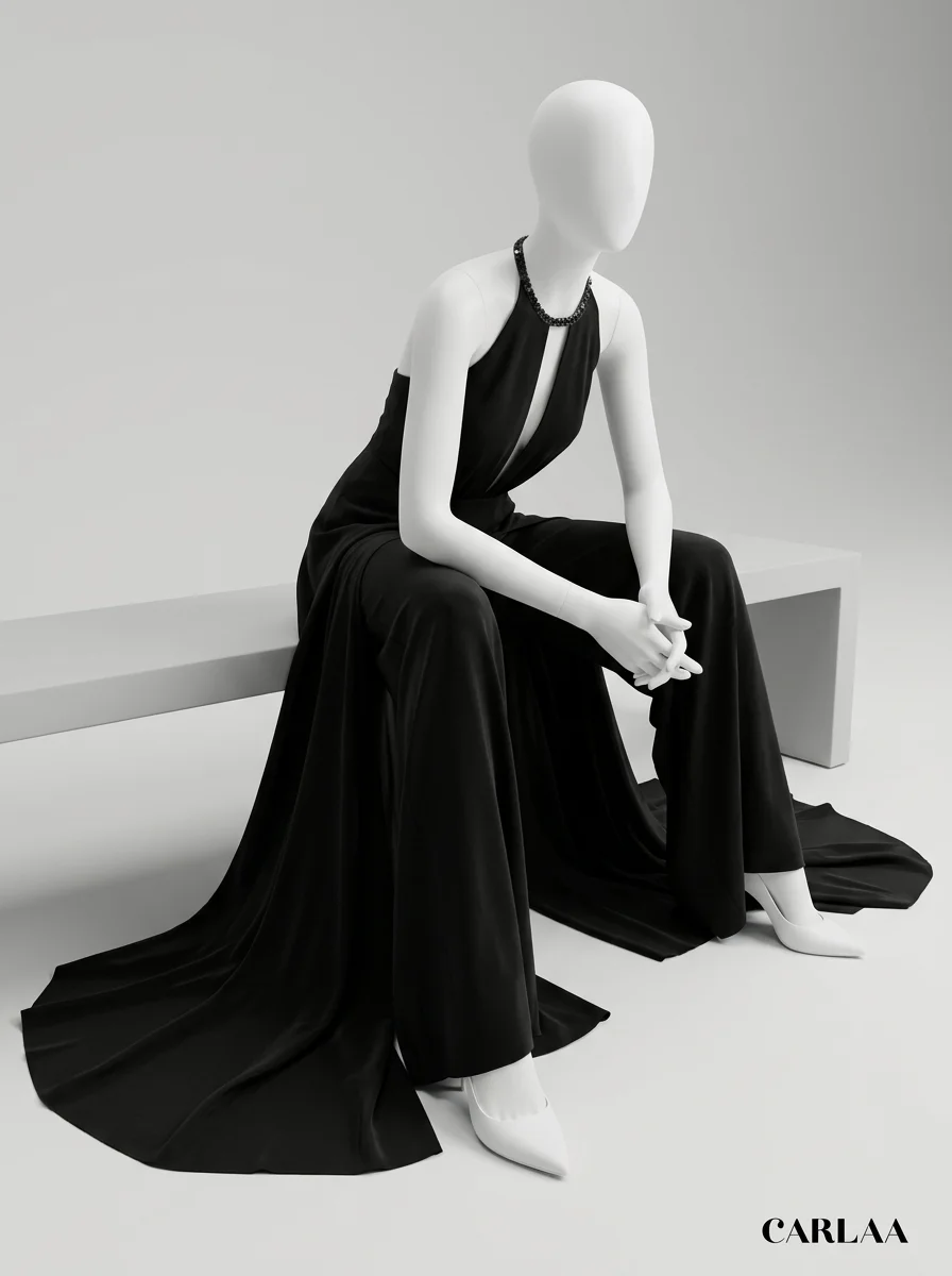 Des jambes larges et vaporeuses s’ouvrent sur une traîne légère, créant un mouvement gracieux à chaque pas. La taille sculptée souligne les courbes avec précision pour une allure de femme moderne et affirmée. Des matières souples comme le spandex garantissent un bien-être durable tout au long des festivités, transformant une simple apparition en un souvenir impérissable.