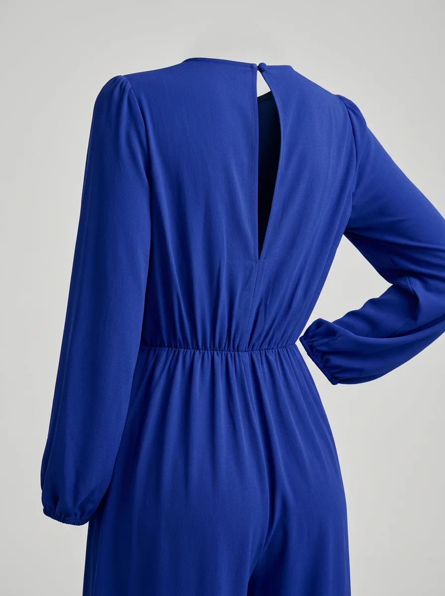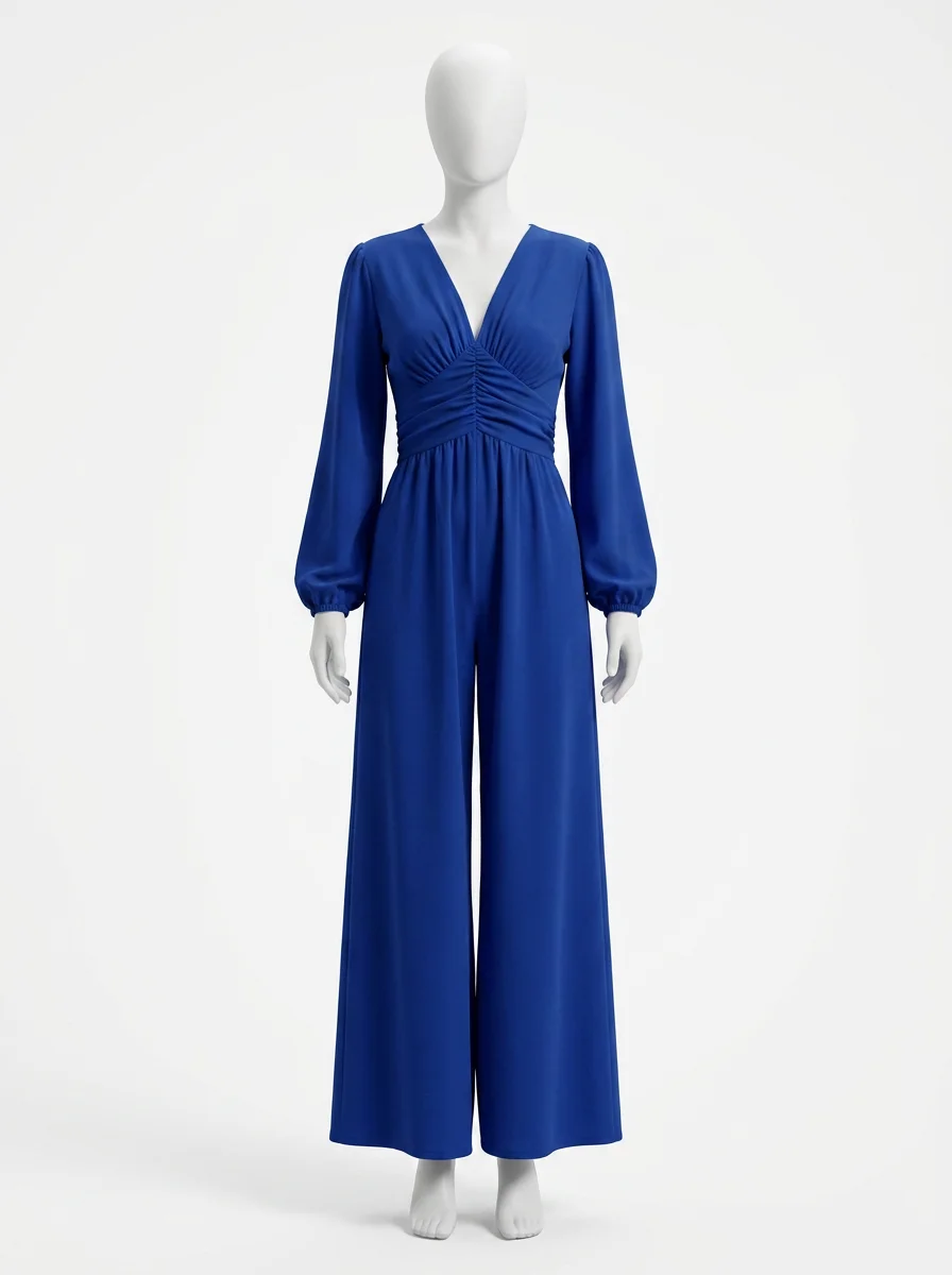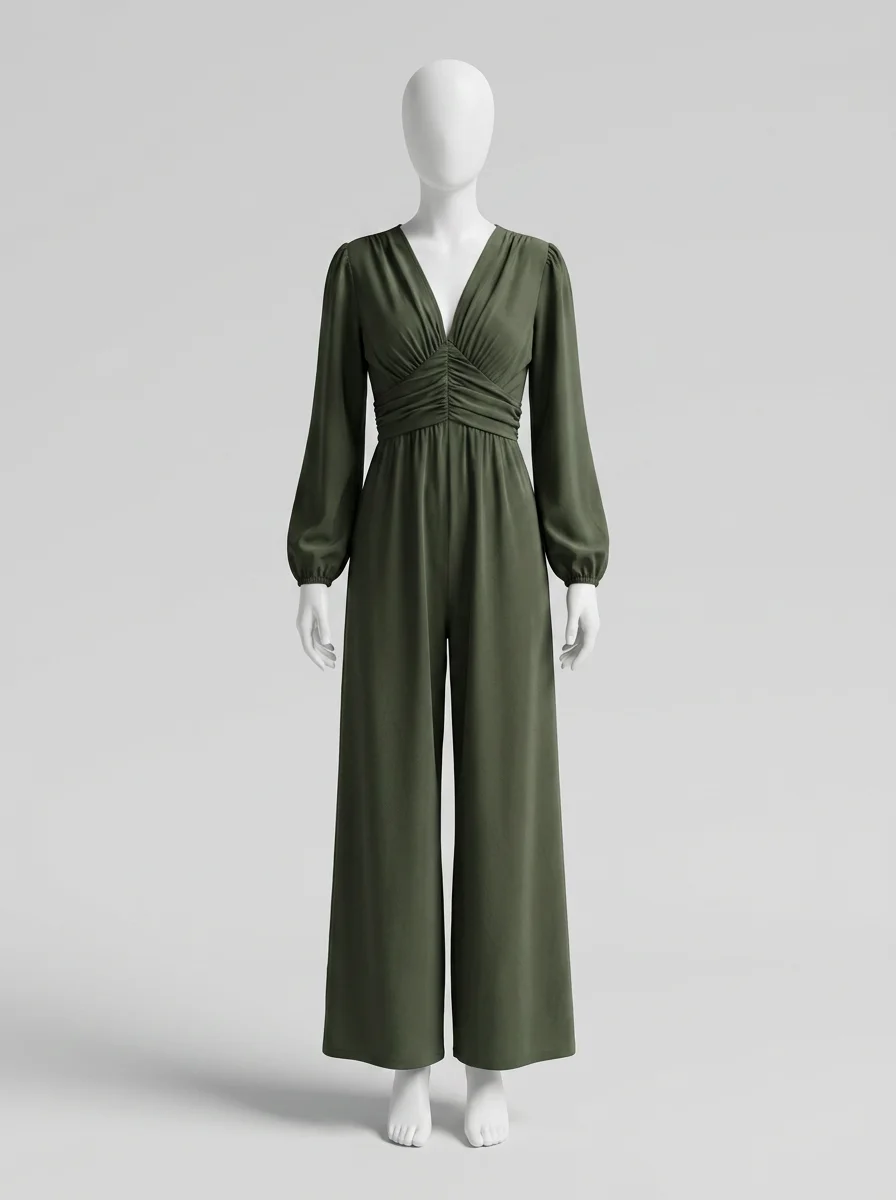 Des manches longues et une coupe ample offrent une liberté de mouvement exceptionnelle. Un décolleté en V et des détails froncés subliment la taille pour créer un look sophistiqué, parfait avec des talons ou des chaussures plates.