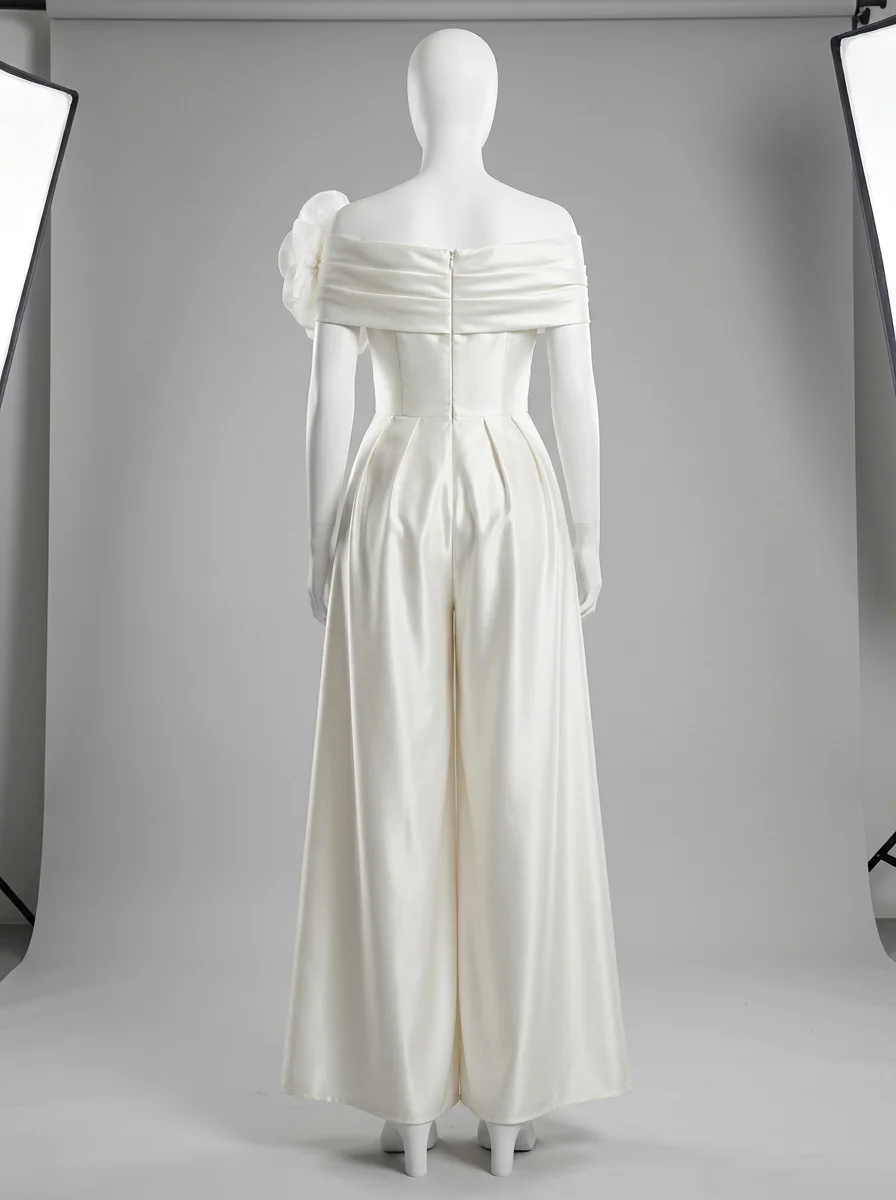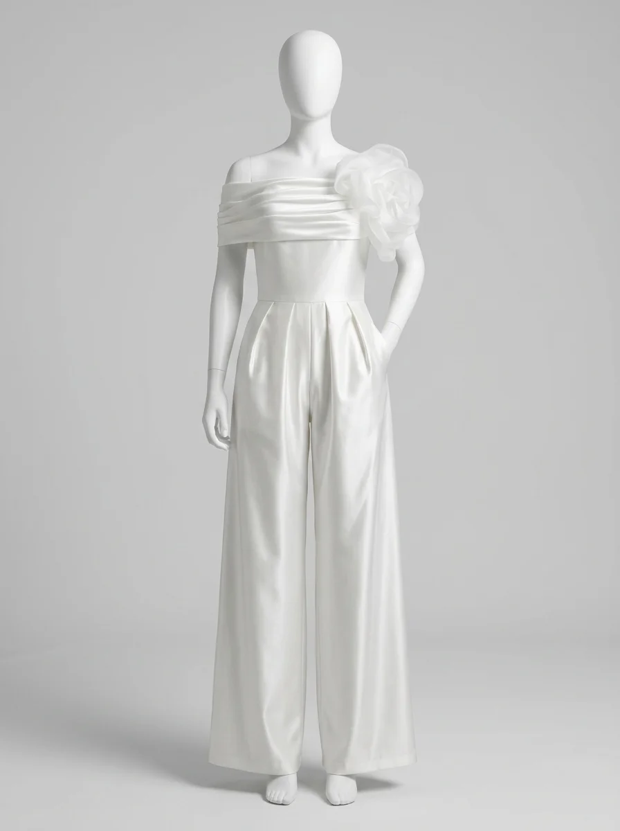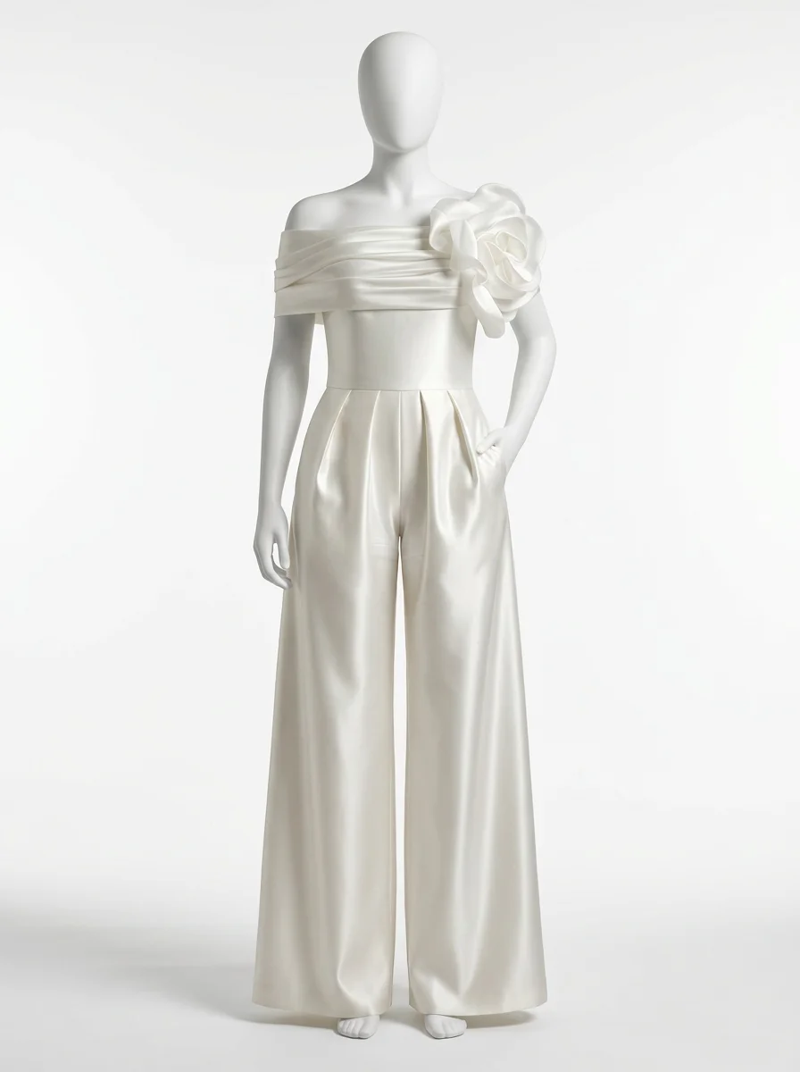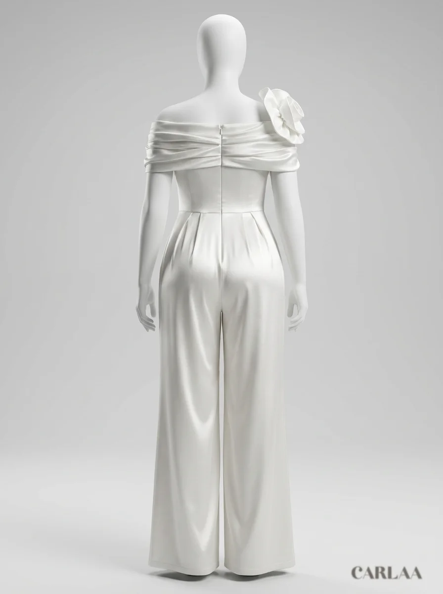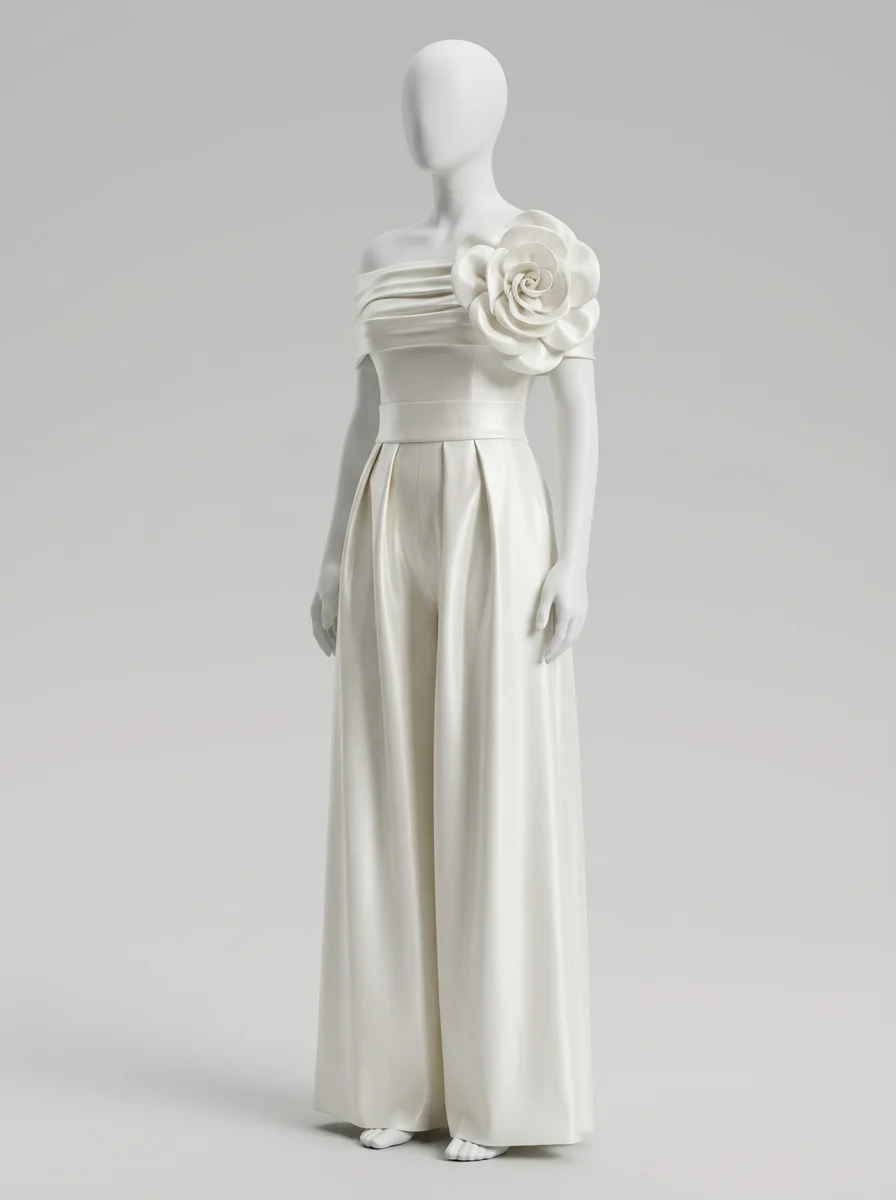 Des coupes flatteuses soulignent la taille tout en offrant un confort absolu grâce à des jambes larges et vaporeuses. L’ornement floral sculptural posé sur l’épaule apporte une dimension artistique unique, transformant une tenue de créateur en une pièce d’exception pour briller jusqu’au bout de la nuit.