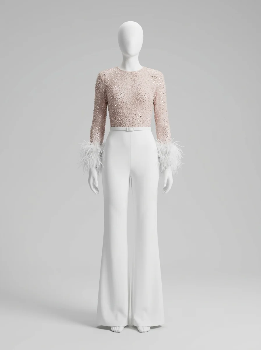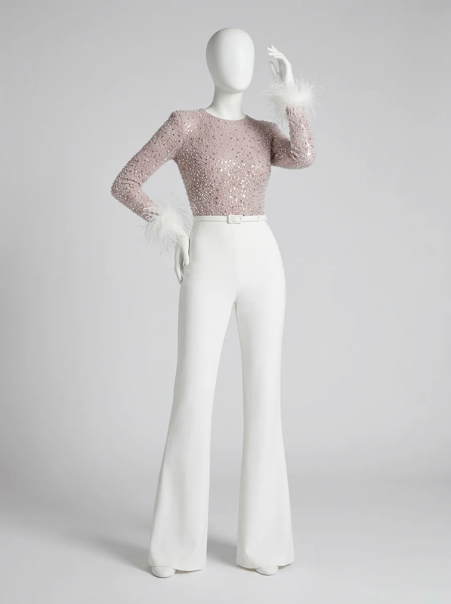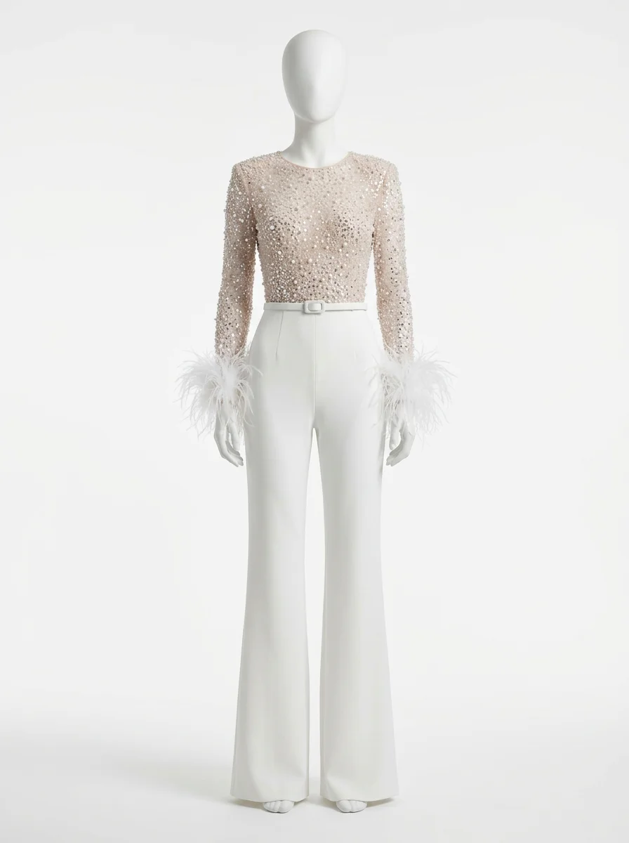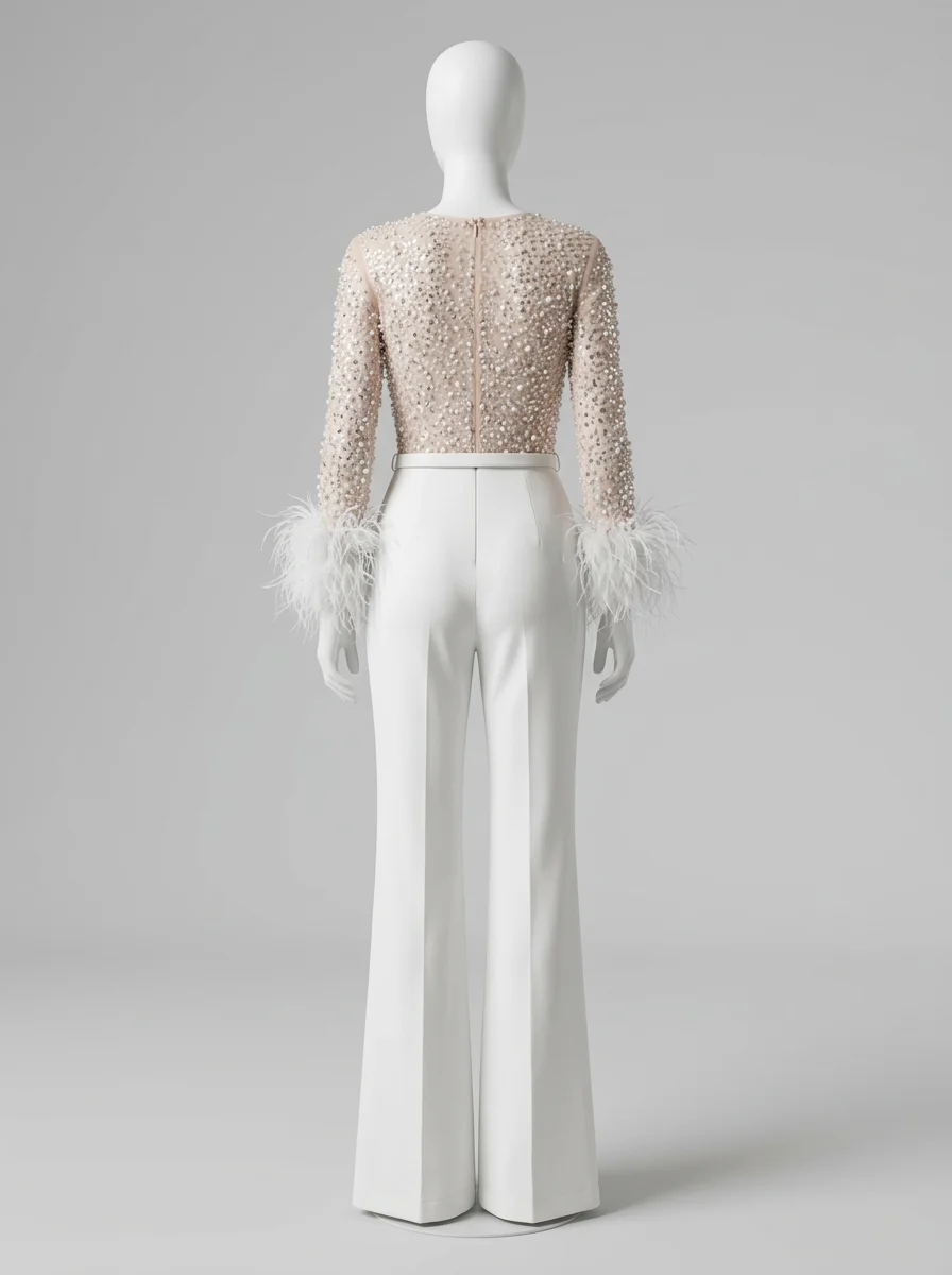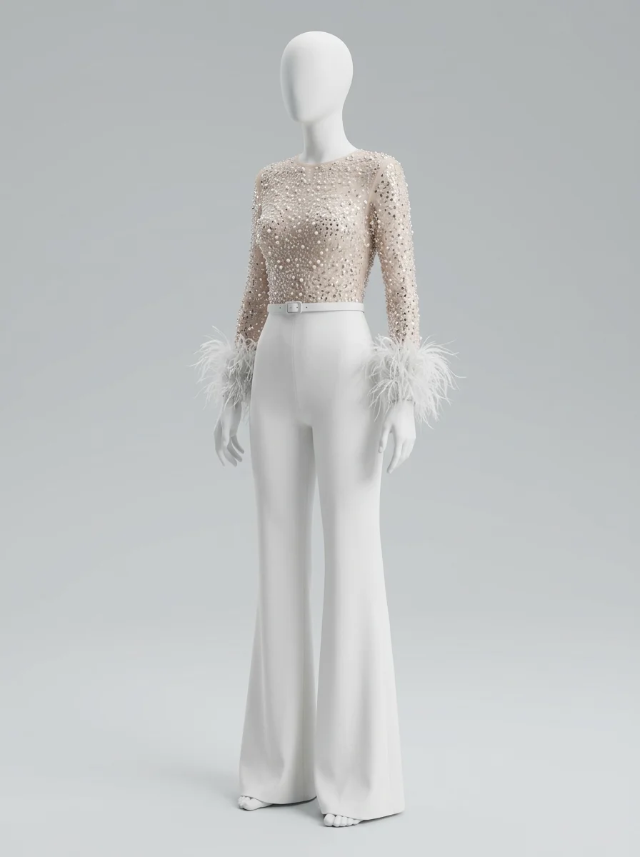 Les silhouettes s’allongent instantanément grâce à une coupe taille haute parfaitement étudiée. Un bustier orné de perles scintillantes capte la lumière avec élégance, tandis que des détails de plumes aux poignets apportent une touche d’originalité rare. Pour trouver la tenue idéale, explorer la combinaison pantalon femme mariage permet de découvrir des modèles prestigieux.