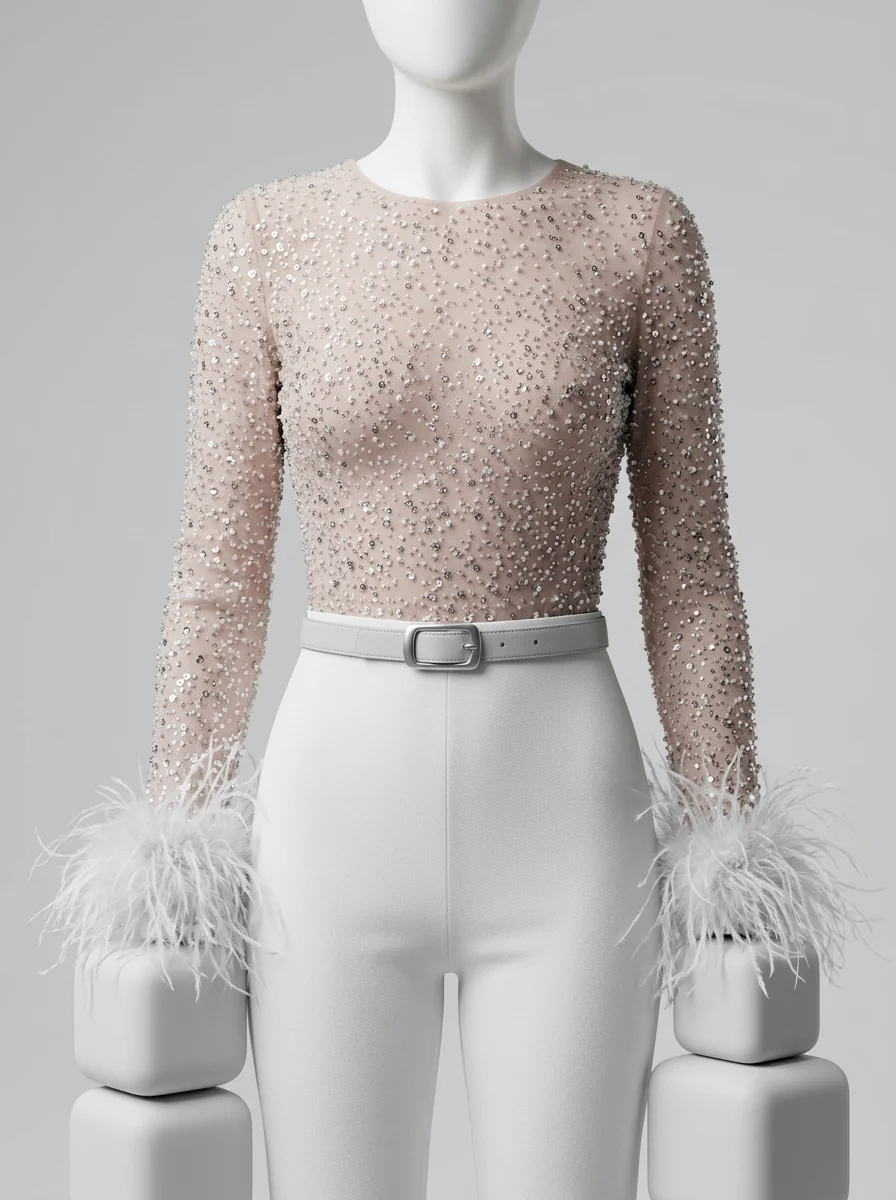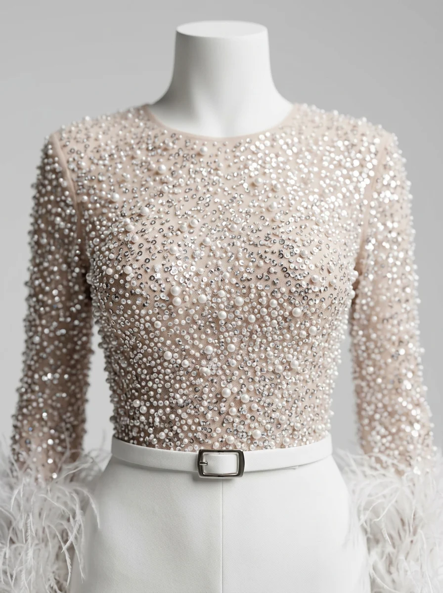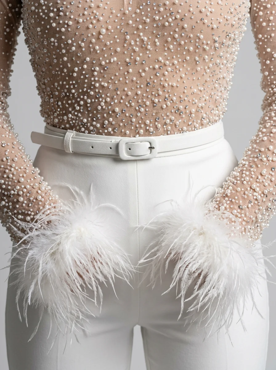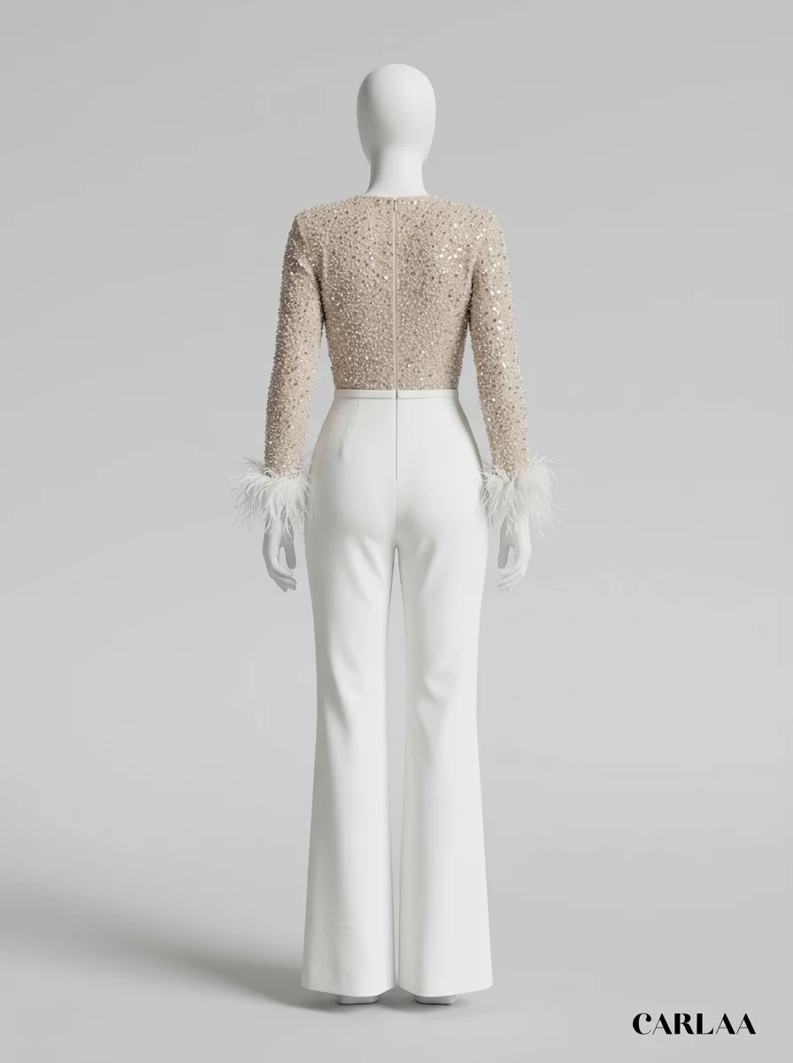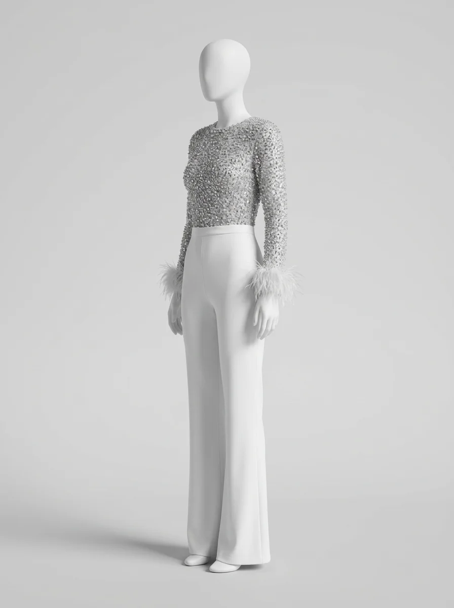 Les silhouettes s’allongent instantanément grâce à une coupe taille haute parfaitement étudiée. Un bustier orné de perles scintillantes capte la lumière avec élégance, tandis que des détails de plumes aux poignets apportent une touche d’originalité rare. Pour trouver la tenue idéale, explorer la combinaison pantalon femme mariage permet de découvrir des modèles prestigieux.