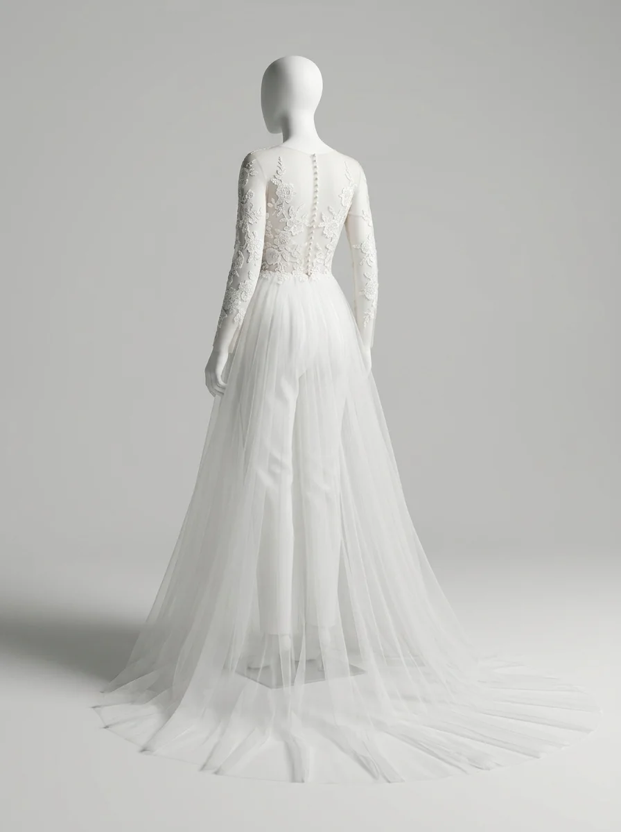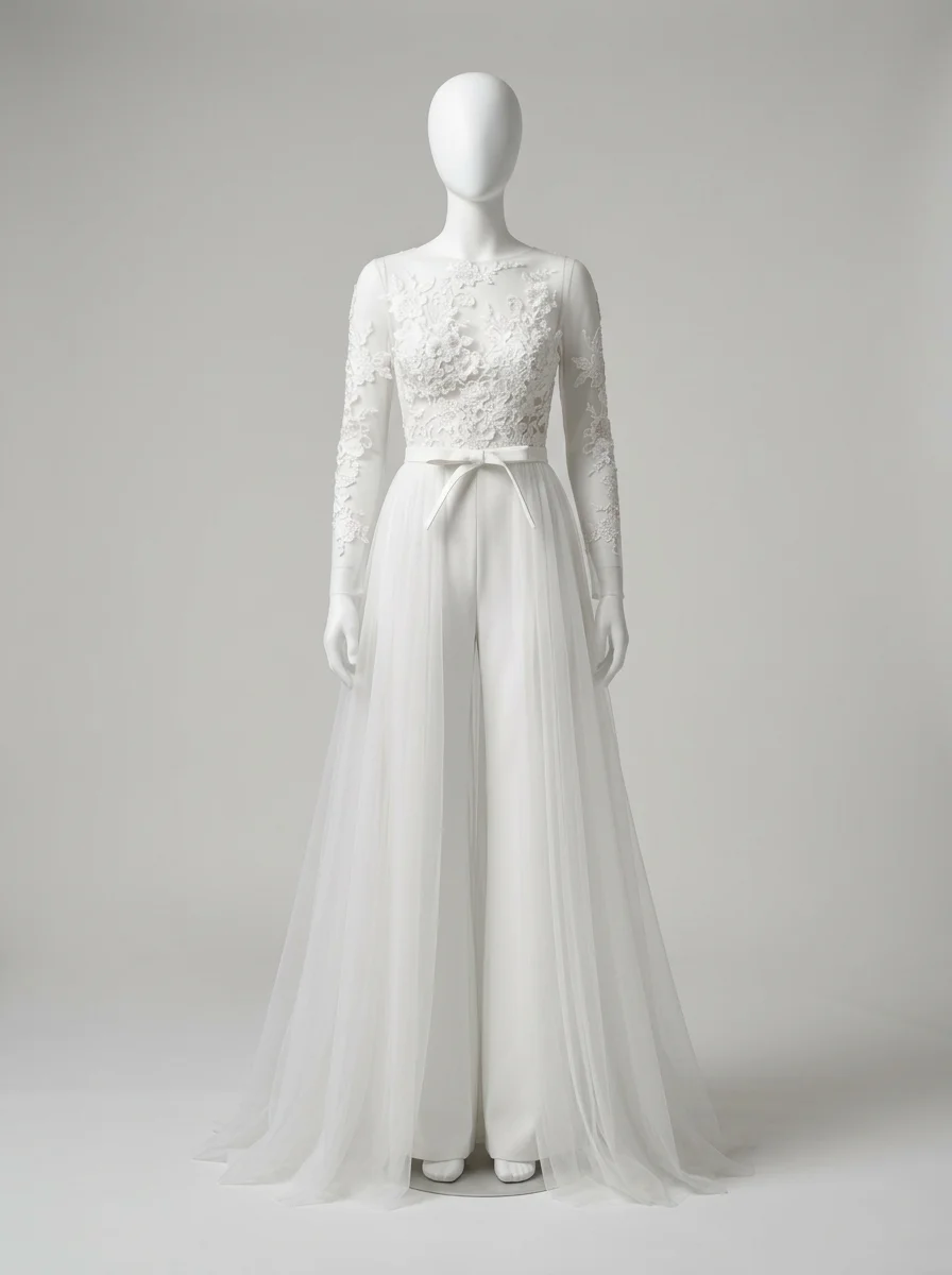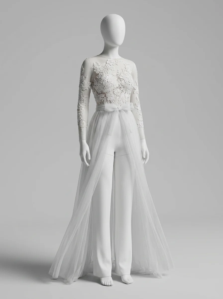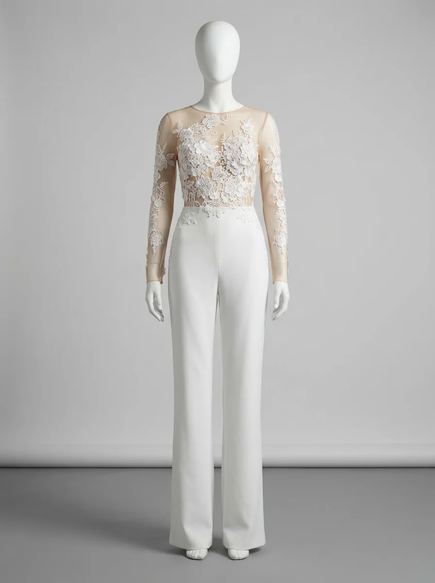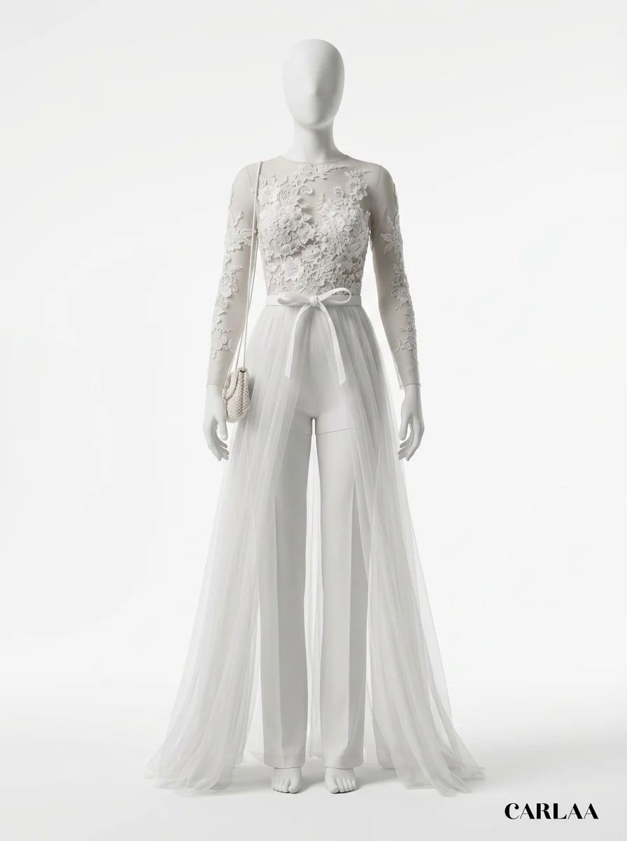 L’union parfaite entre la tradition d’une robe et le confort d’un pantalon se révèle dans une création d’exception. Des appliqués floraux délicats ornent le bustier pour offrir un jeu de transparence raffiné, idéal pour une combinaison pantalon soiree ou une cérémonie de mariage inoubliable.