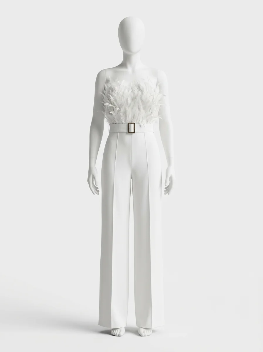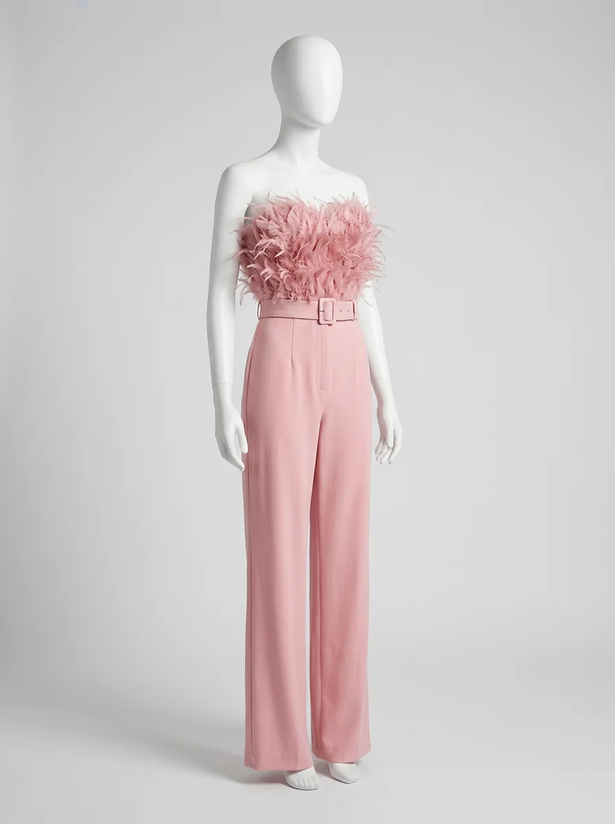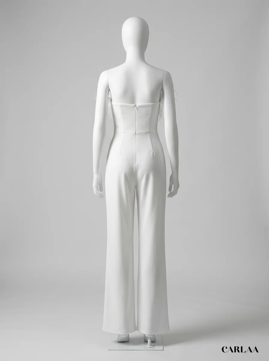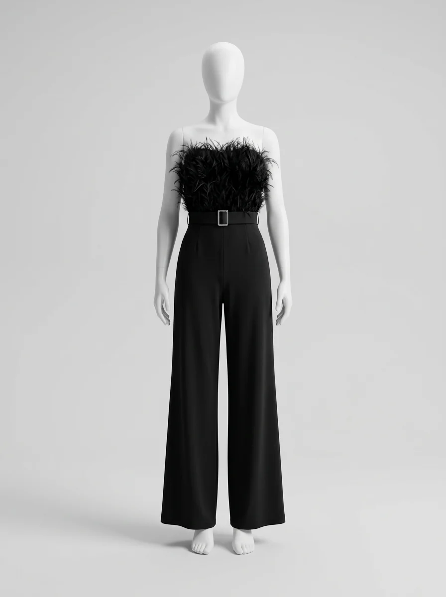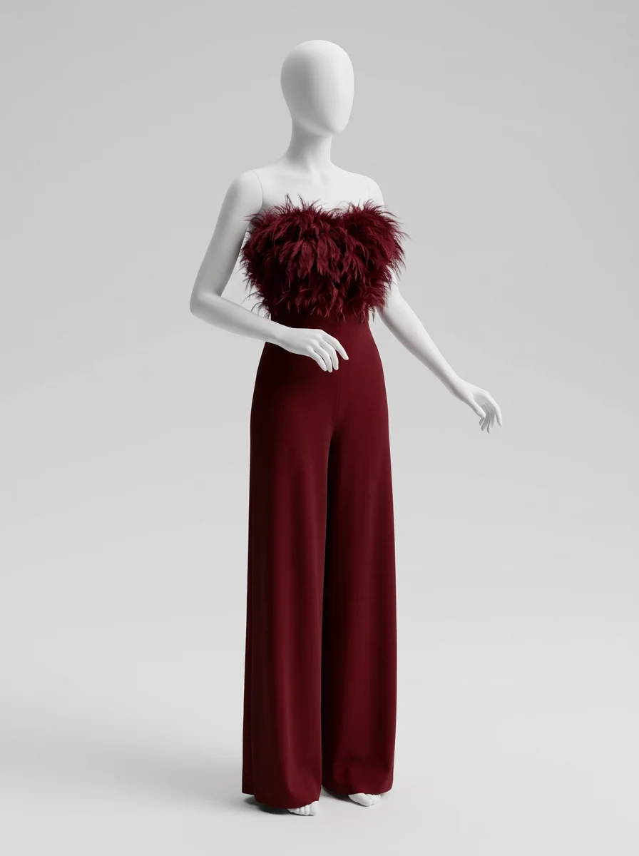 Les plumes luxueuses ornant le bustier apportent une texture riche et un raffinement incomparable. Un design sans bretelles sublime le décolleté, alors qu’une ceinture intégrée définit une silhouette élancée. Pour varier les plaisirs lors des réceptions, une combinaison pantalon bordeaux constitue un choix de caractère tout aussi distingué.
