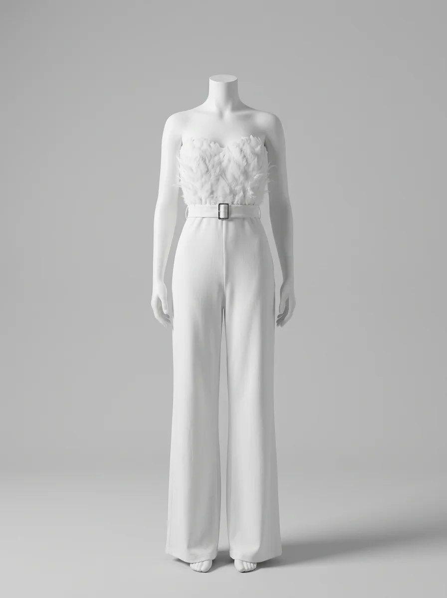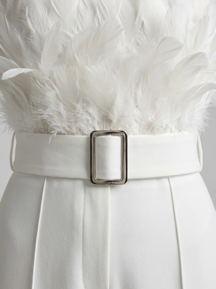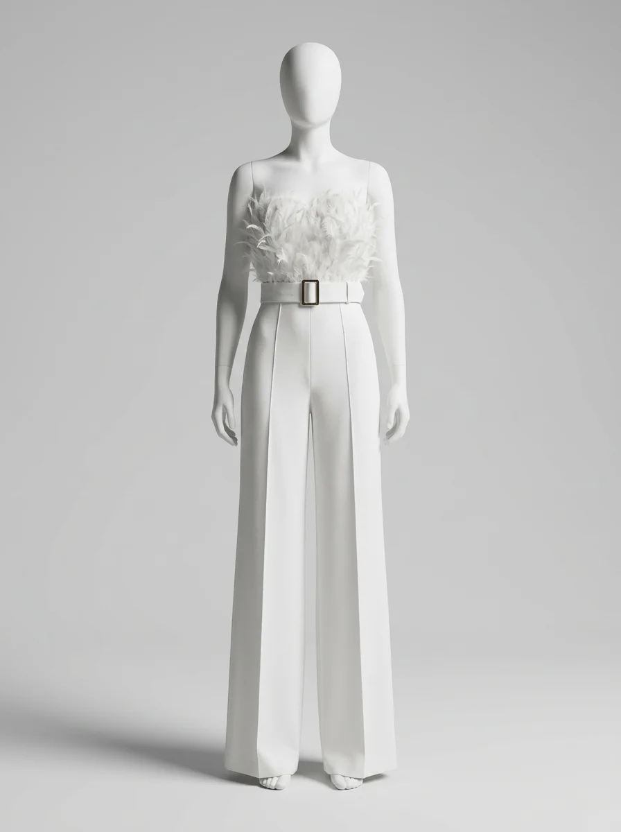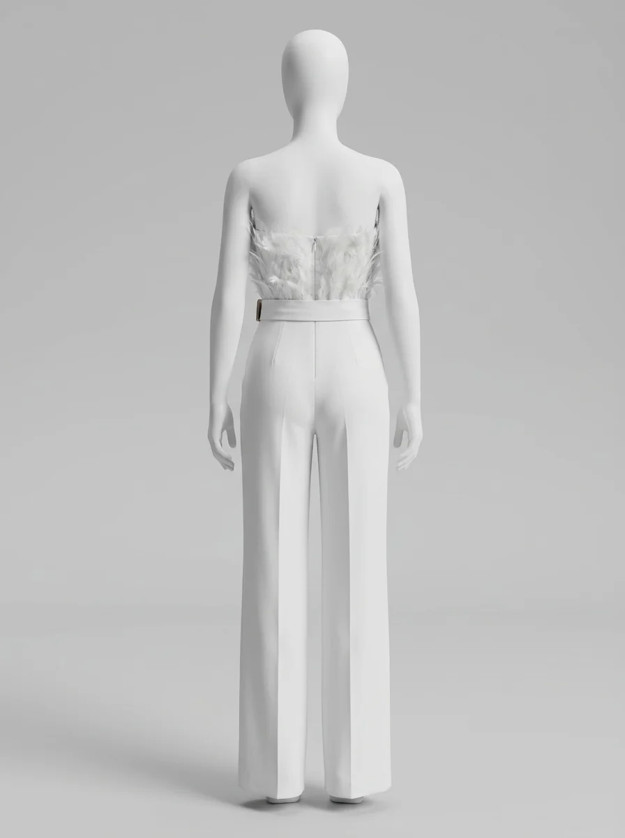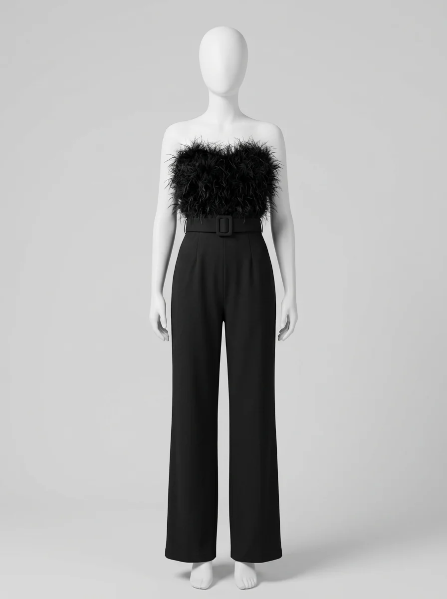 Les plumes luxueuses ornant le bustier apportent une texture riche et un raffinement incomparable. Un design sans bretelles sublime le décolleté, alors qu’une ceinture intégrée définit une silhouette élancée. Pour varier les plaisirs lors des réceptions, une combinaison pantalon bordeaux constitue un choix de caractère tout aussi distingué.