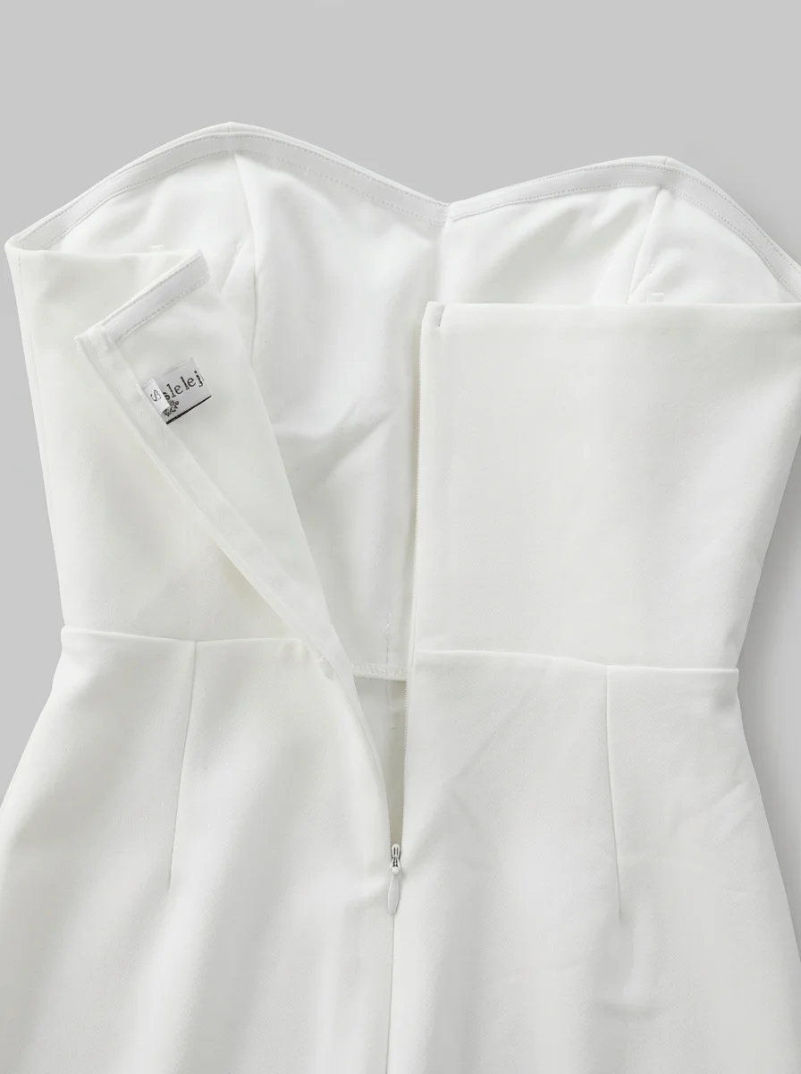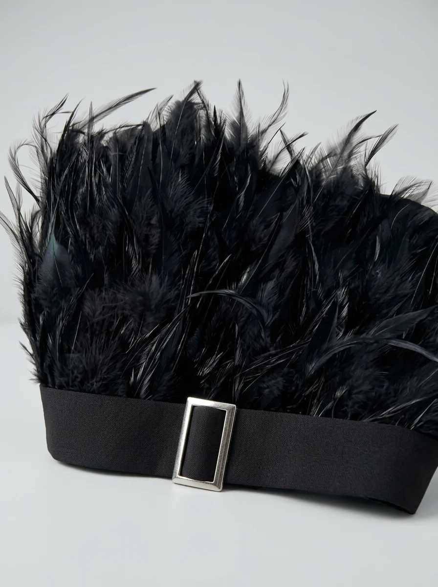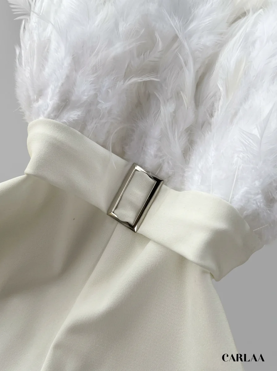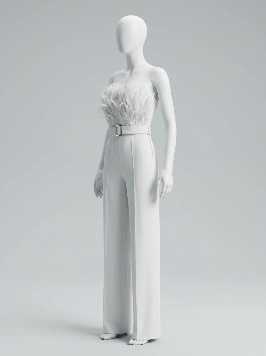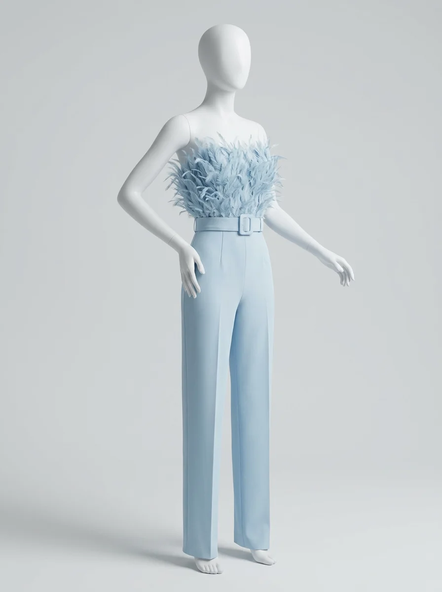 Les plumes luxueuses ornant le bustier apportent une texture riche et un raffinement incomparable. Un design sans bretelles sublime le décolleté, alors qu’une ceinture intégrée définit une silhouette élancée. Pour varier les plaisirs lors des réceptions, une combinaison pantalon bordeaux constitue un choix de caractère tout aussi distingué.