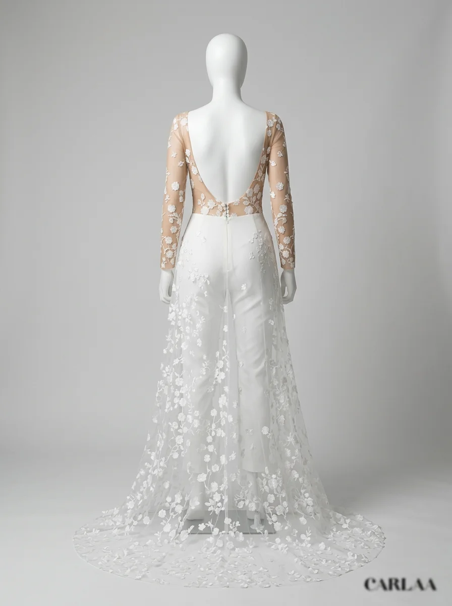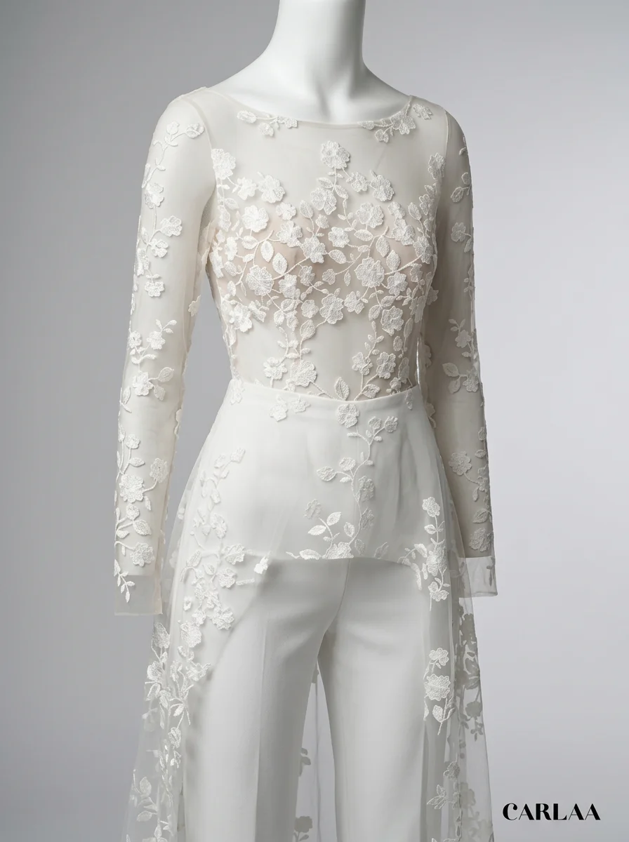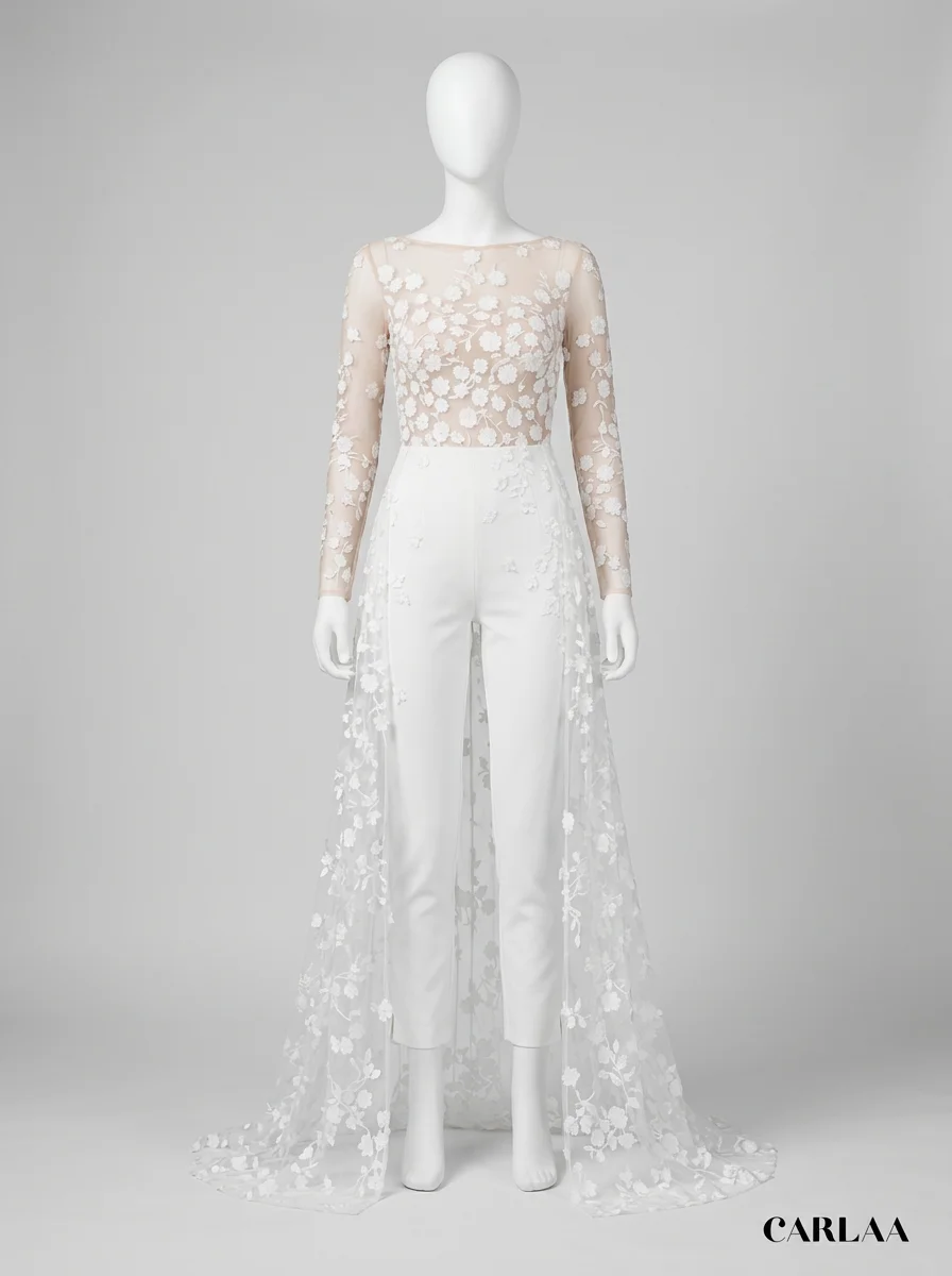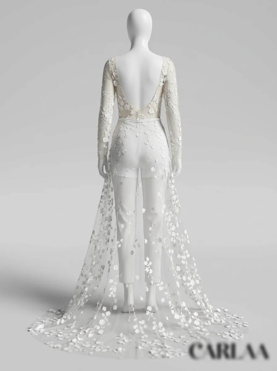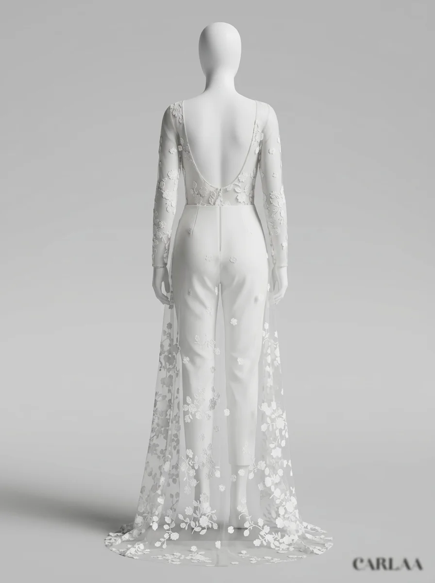 La présence d’une traîne amovible permet de varier les styles avec aisance. Une tenue de mariage composée de manches longues transparentes et d’une coupe slim crée un équilibre parfait entre audace et romantisme. Découvrez notre collection combinaison pantalon femme habillée.