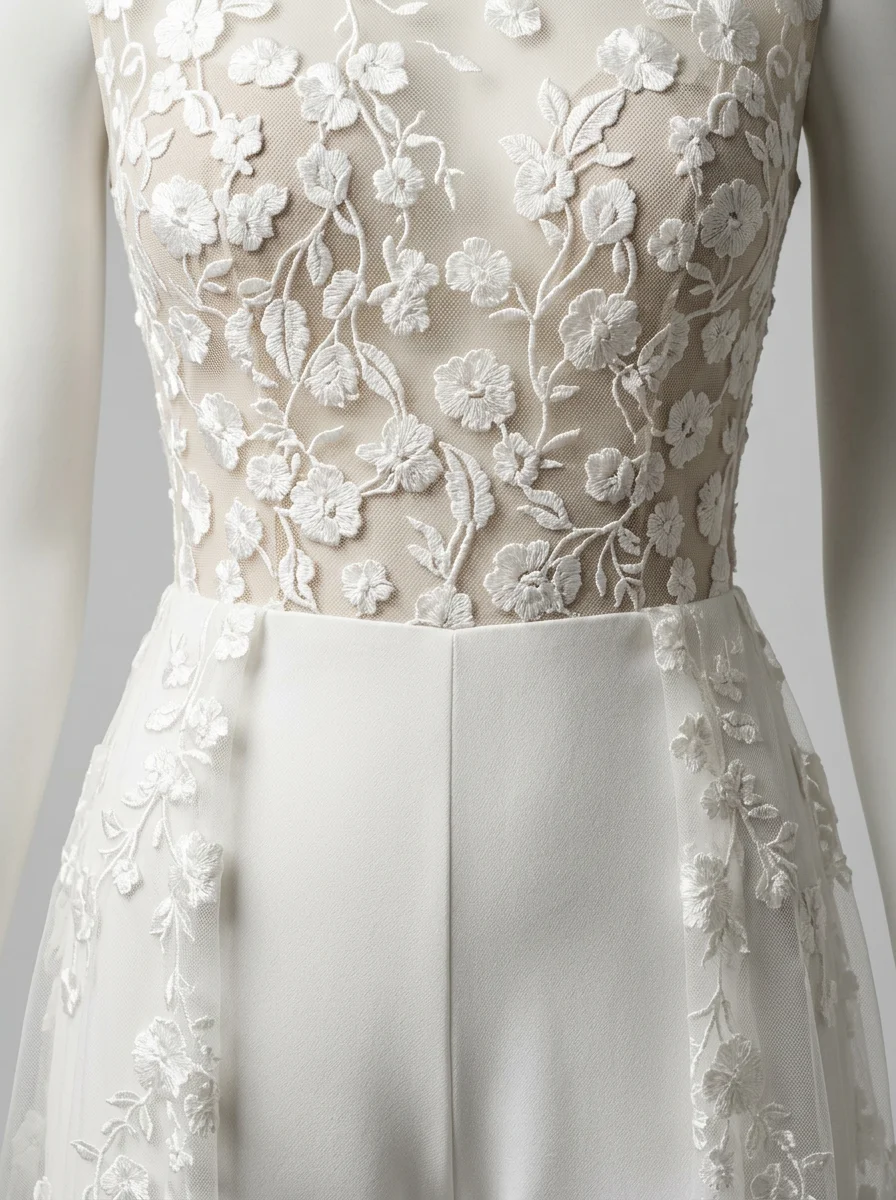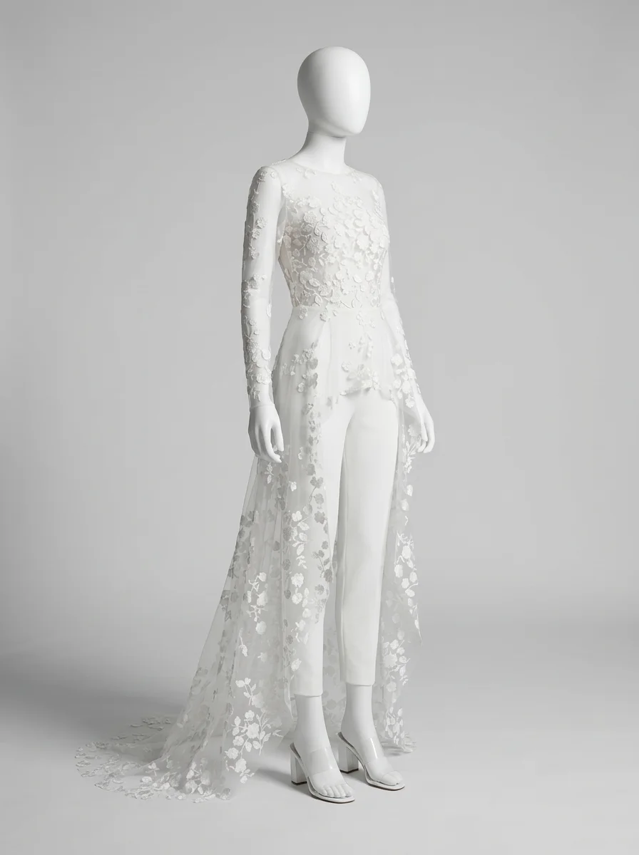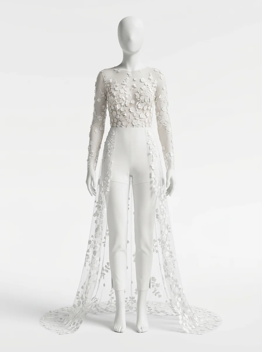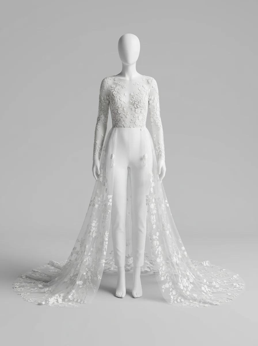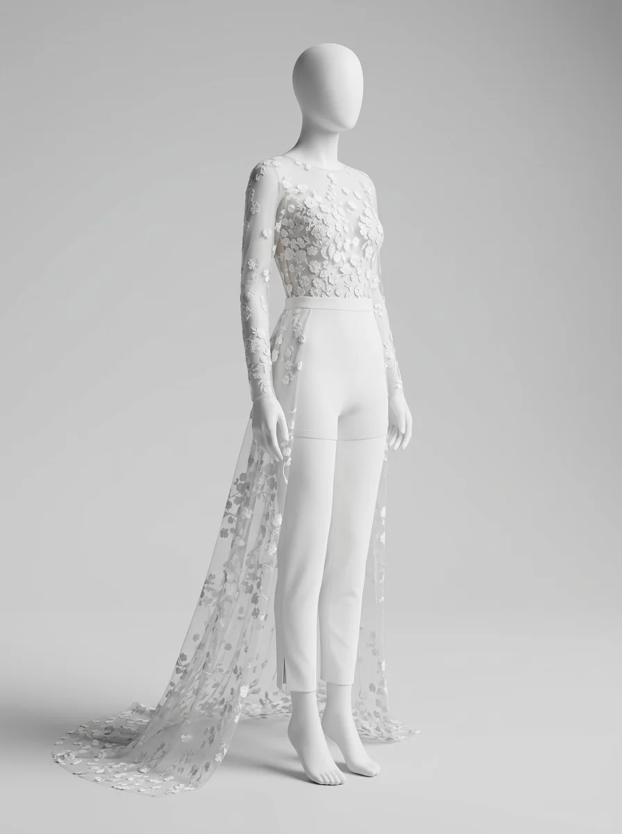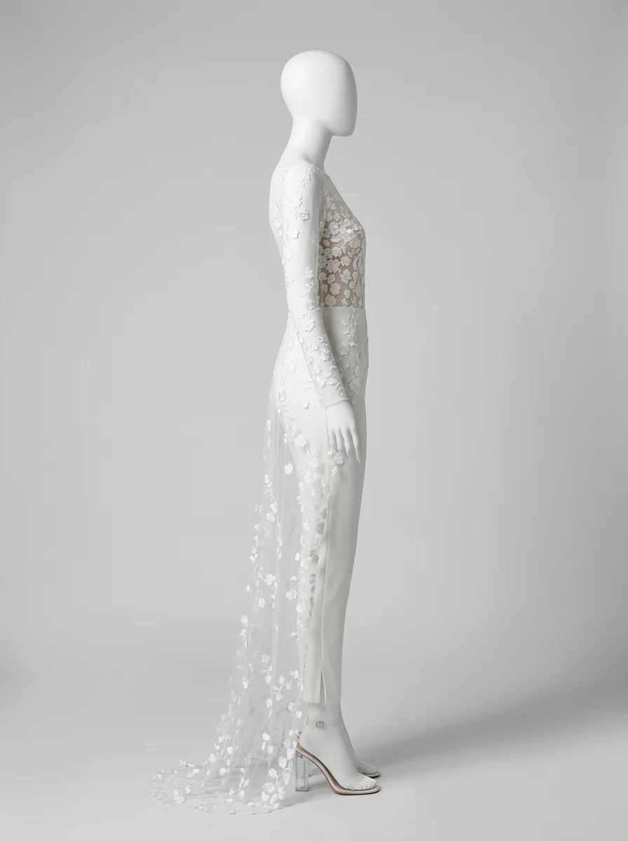 La présence d’une traîne amovible permet de varier les styles avec aisance. Une tenue de mariage composée de manches longues transparentes et d’une coupe slim crée un équilibre parfait entre audace et romantisme. Découvrez notre collection combinaison pantalon femme habillée.