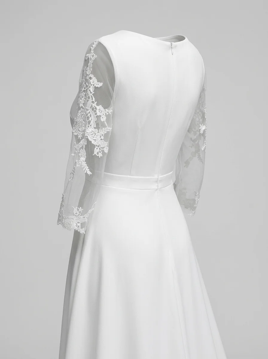Des manches en dentelle travaillée apportent une note de romantisme classique à une coupe résolument actuelle. Les vêtements de cérémonie haut de gamme permettent une liberté de mouvement totale tout en garantissant une présence sophistiquée jusqu’à la piste de danse.